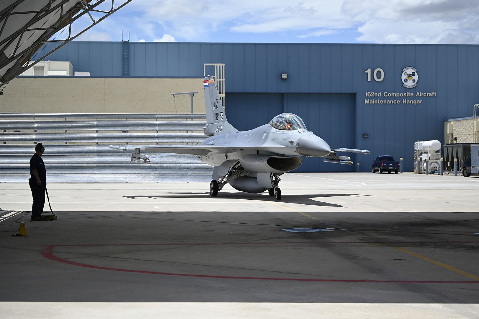 An F-16 Aggressor assigned to the 64th Aggressor Squadron, Nellis Air Force Base, Nevada, waits to take off for a mission during Red Flag-Nellis 22-3, July 20, 2022. During Red Flag 22-3 the aggressor nation refines threat replication, applies advanced threats and jamming capabilities and increased threat capabilities to maximize training in non-permissive environments. (U.S. Air Force photo by William R. Lewis)