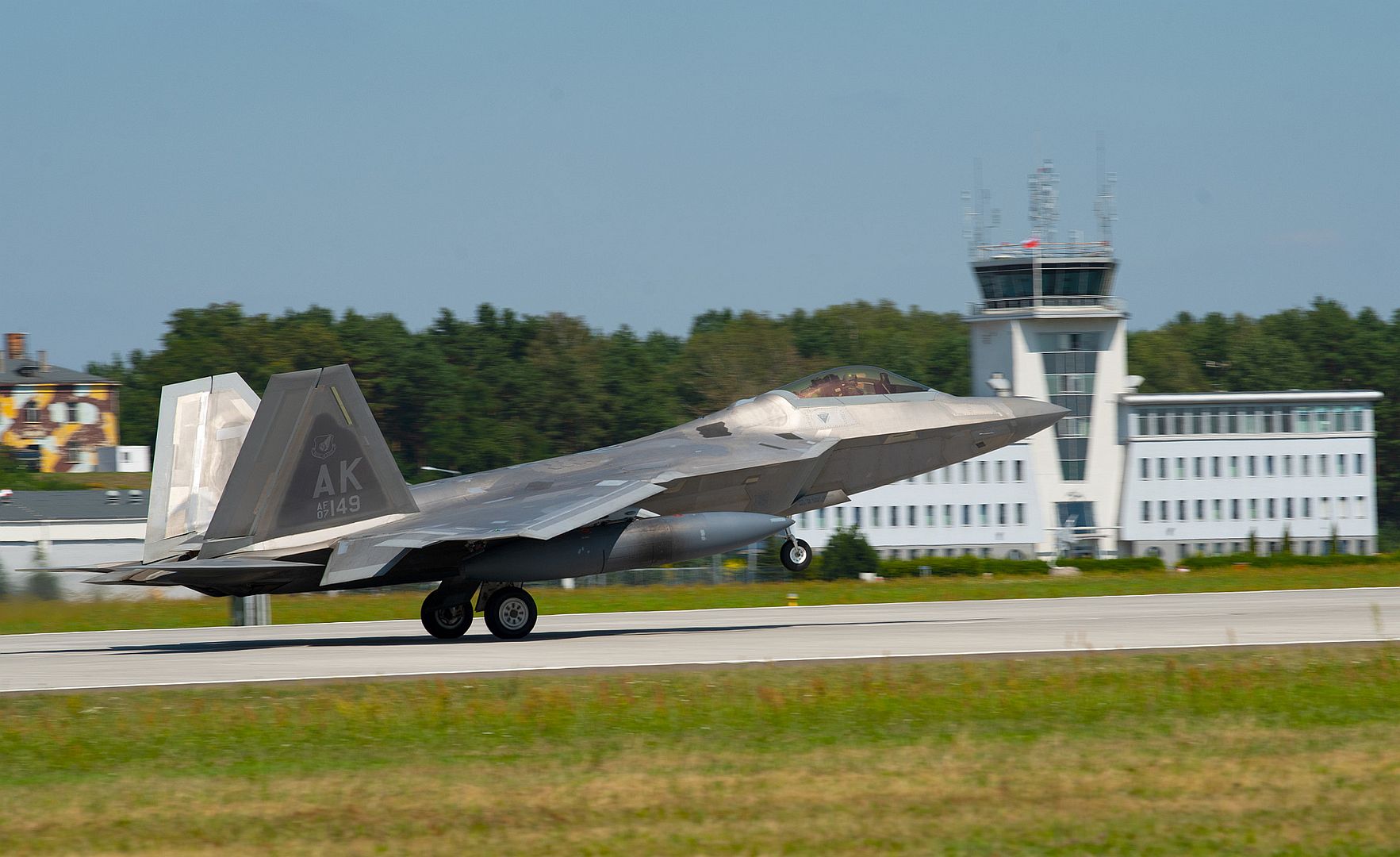 A U.S. Air Force F-22 Raptor assigned to the 90th Fighter Squadron, 3rd Wing landed at the 32nd Tactical Air Base in Łask, Poland to support NATO Air Shielding in the European Theater August 4, 2022. The NATO Shielding mission is a joint integrated mission to increase the air and missile defense posture along the Eastern flank of the Alliance. (U.S. Air Force photo by Staff Sergeant Danielle Sukhlall)