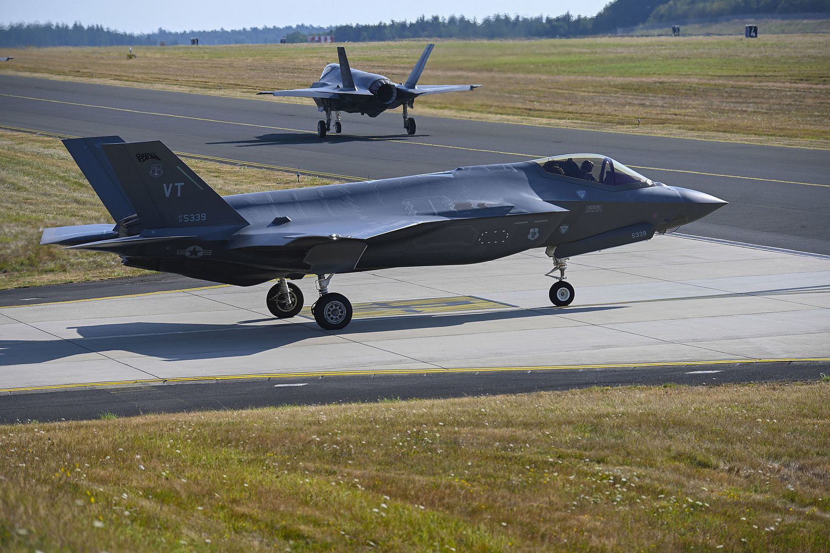 Two F-35A Lightning II aircraft assigned to the 158th Fighter Wing, Vermont Air National Guard, prepare to take off from Spangdahlem Air Base, Germany, August 2, 2022. Eight fighters from Vermont arrived at Spangdahlem on May 2, 2022, to continue to support and integrate, hardening the alliance’s solidarity, collective resolve, overall increasing NATOs ability to adapt to a dynamic warfighting environment. (U.S. Air Force photo by Tech. Sgt. Warren D. Spearman Jr.)