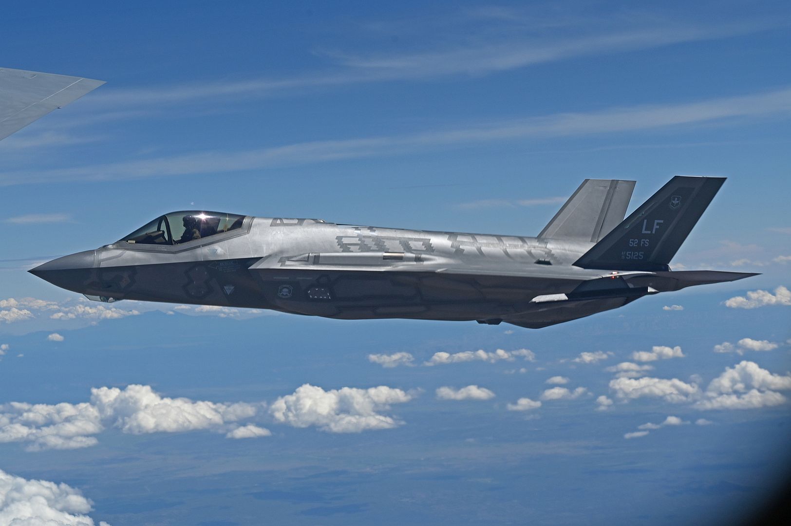 A U.S. Air Force F-35 Lightning II from the 52nd Fighter Squadron flies in alongside a KC-135 Stratotanker from the 197th Air Refueling Squadron during a training mission above Arizona, Aug. 6, 2022. The 161st Air Refueling Wing out of the Goldwater Air National Guard Base, conducts refueling missions with their regional partners at Luke Air Force Base regularly to help ensure mission readiness.