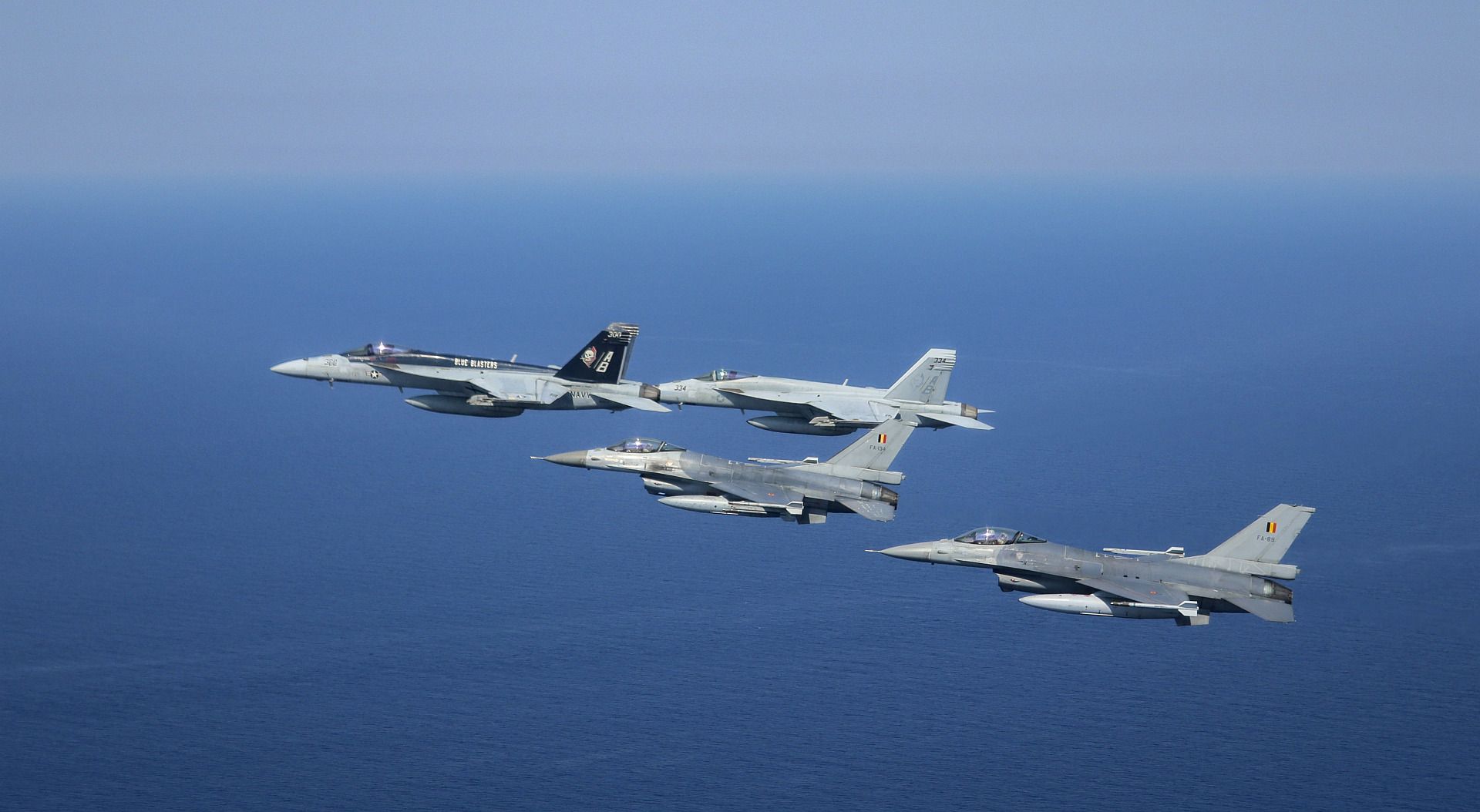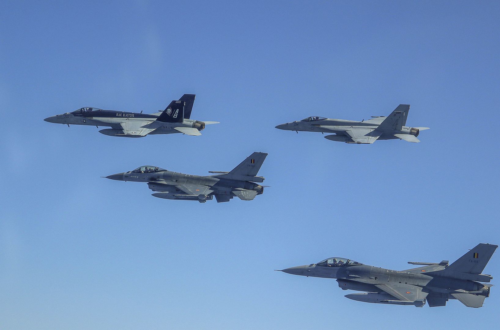 MEDITERRANEAN SEA (July 25, 2022) F/A-18E Super Hornets, attached to Carrier Air Wing 1 (CVW-1) and Belgian Air Force F-16s fly in formation over the Mediterranean Sea, July 25, 2022. The Harry S. Truman Carrier Strike Group is on a scheduled deployment in the U.S. Naval Forces Europe area of operations, employed by U.S. Sixth Fleet to defend U.S., allied and partner interests. (U.S. Navy photos courtesy of Strike Fighter Squadron 11)