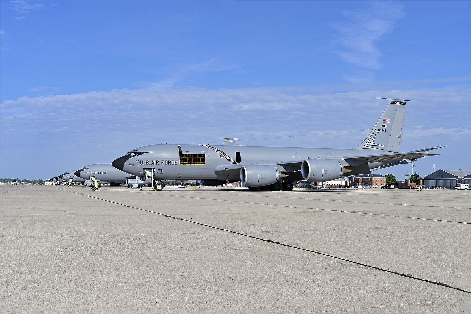 A U.S. Air Force F-22 Raptor assigned to the 3rd Wing, and an F-16 Fighting Falcon assigned to Eielson Air Force base fly next to a KC-135 Stratotanker assigned to the 117th Aerial Refuel Squadron, Forbes Field, Kansas during RED FLAG-Alaska 22-3 over the Joint Pacific Alaska Range Complex, Alaska, August 2, 2022. The JPARC is the largest instrumented air, ground, and electronic combat training range in the world (U.S. Air Force photo by Airman 1st Class Andrew Britten)