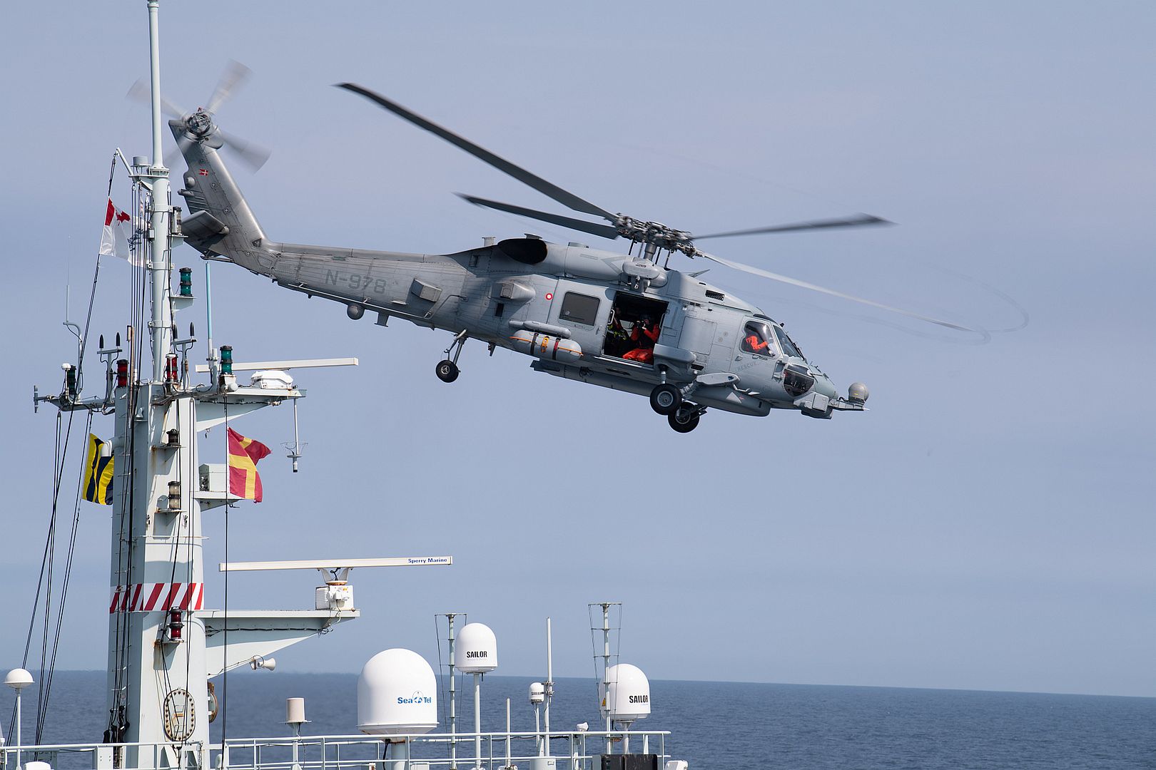 Main AdminA Royal Danish Navy MH-60R helicopter attached to HDMS Triton flies above the mast of the Royal Canadian Navy vessel HMCS Goose Bay during Operation Nanook, Northern Atlantic Ocean, Aug. 5, 2022. Operation Nanook is a multinational military exercise highlighting the abilities of the United States and partner nations to advance shared maritime objectives. (U.S. Coast Guard photo by Petty Officer 3rd Class Matthew Abban)