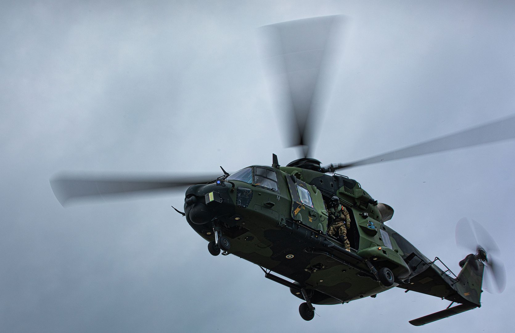 A Finnish NH90 utility helicopter transports troops as part of a multinational hot and cold load training in preparation for exercise Vigilant Fox held at Niinisalo, Finland, July 25, 2022. The 3rd Armored Brigade Combat Team, 4th Infantry Division, and units of the Finnish army began summer training in Finland to strengthen relations and help build interoperability between the two nations. (U.S. Army National Guard photo by Sgt. Agustín Montañez)