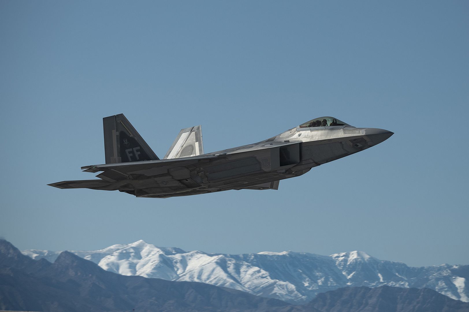 An F-22 Raptor assigned to the 1st Fighter Wing, Joint Base Langley Eustis, Virginia, takes off for a mission during Red Flag 23-1 at Nellis Air Force Base, Nevada, Feb. 9, 2023. The 414th Combat Training Squadron conducts Red Flag exercises to provide aircrews the experience of multiple, intensive air combat sorties in the safety of a training environment. (U.S. Air Force photo by William R. Lewis)