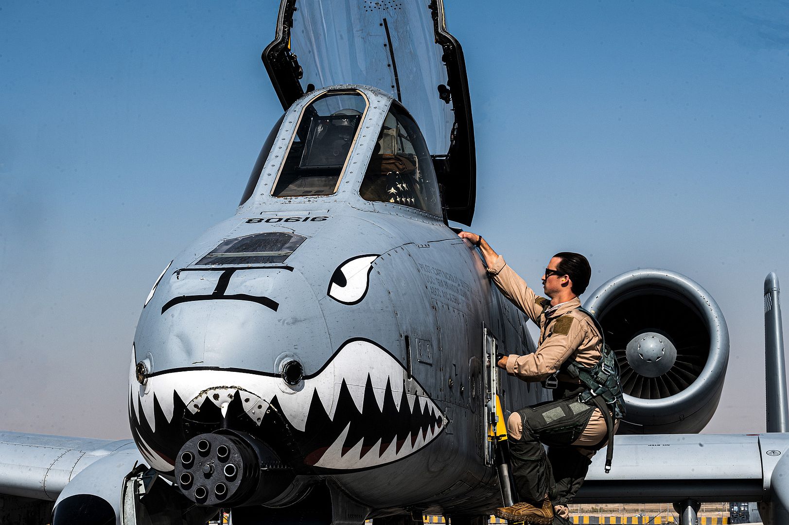 U.S. Air Force Captain Connor Jones, 75th Expeditionary Fighter Squadron A-10 Thunderbolt II pilot, climbs into his aircraft before the first sortie at Al Dhafra Air Base, United Arab Emirates, April 6, 2023. Since its creation in 1975, the A-10 has provided air support to ground troops, destroying adversary forces and infrastructure as the first aircraft designed specifically for close air support. (U.S. Air Force photo by Staff Sgt Sabatino DiMascio)