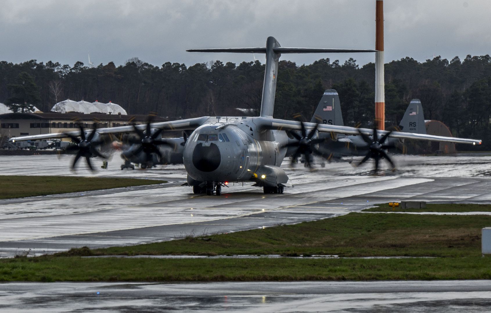 A German air force A-400M Atlas aircraft prepares for take-off at Ramstein Air Base, Germany, March 31, 2023. Training objectives for International Interfly Week included establishing standard operating procedures between various aircraft, maximizing defensive capabilities at various points of flying formations, and developing contingencies for completing airdrops in normal and adverse weather conditions. (U.S. Air Force photo by Staff Sgt. Megan M. Beatty)