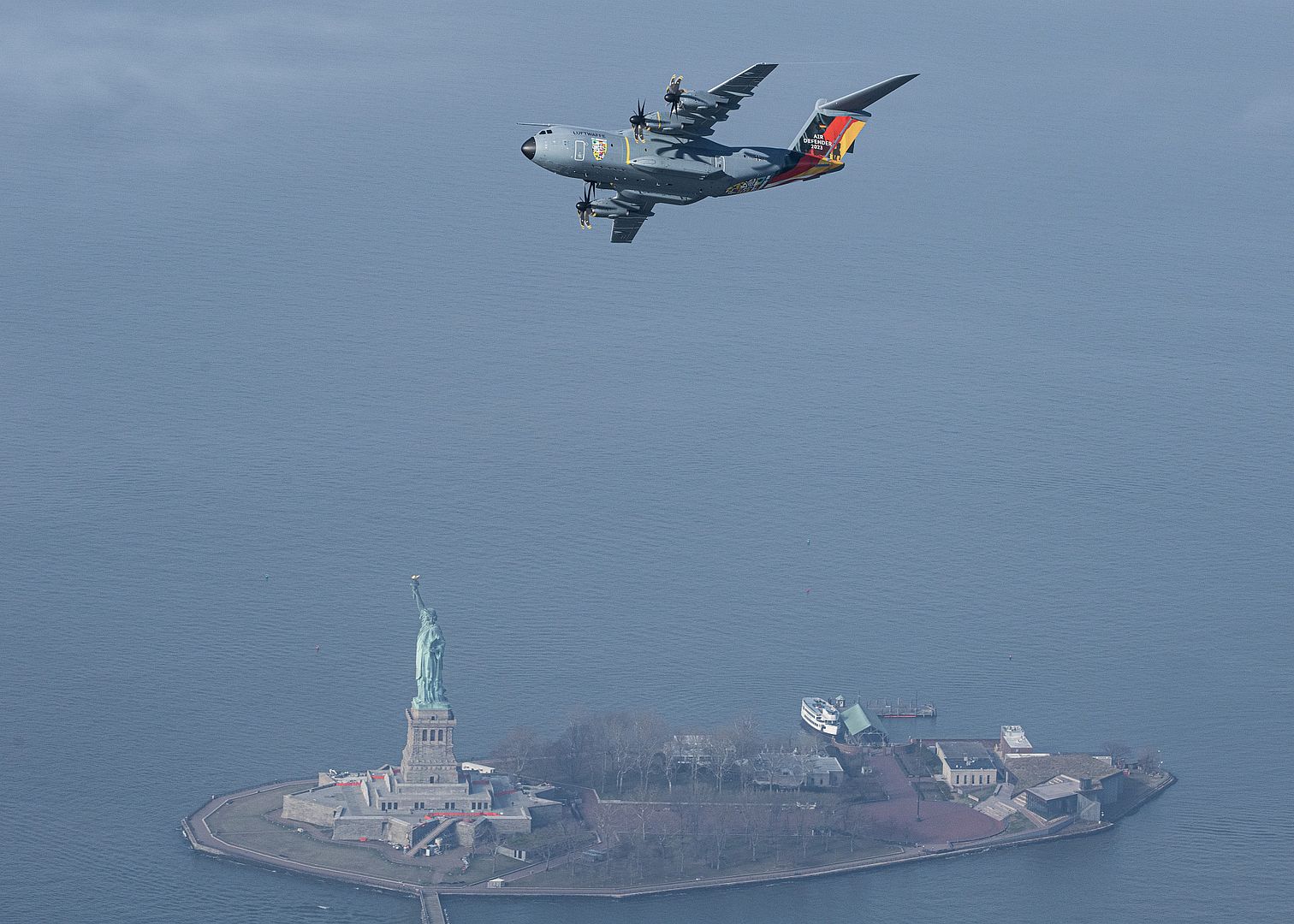 A custom painted German Airbus A400M Atlas flies over the Statue of Liberty in New York, N.Y., April. 3, 2023. Members of the German air force and German media visited the U.S. in preparation for Air Defender 2023. (U.S. Air National Guard photo by Staff Sergeant Daniel Farrell)