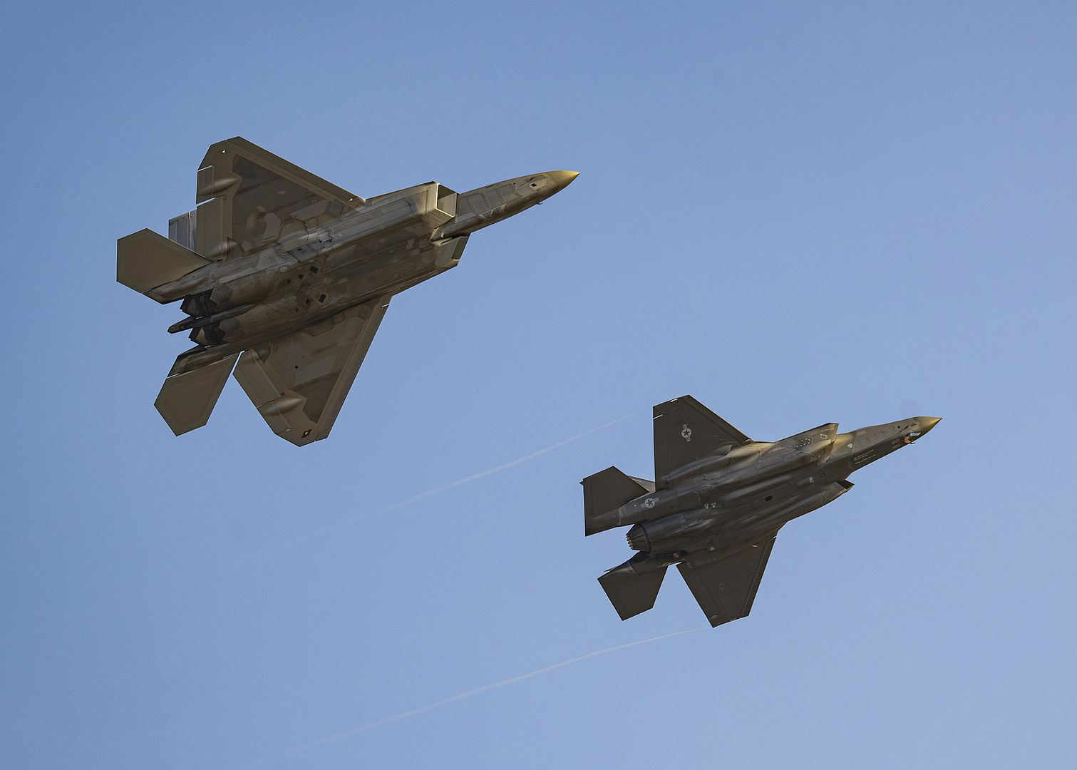 Main AdminA U.S. Air Force F-22 Raptor, assigned to the F-22 Demonstration Team, flies alongside an F-35A Lightning II, assigned to the F-35A Lightning II Demonstration Team, during a practice airshow at Hill Air Force Base, Utah, Dec. 5, 2024. The two demonstration team pilots honed their skills flying in close proximity, preparing for this formation commonly used for heritage flights. (U.S. Air Force photo by Senior Airman Nicholas Rupiper)