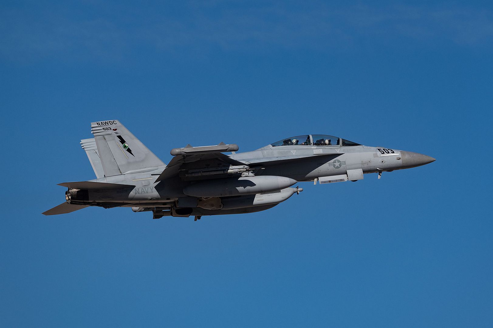 A U.S. Navy EA-18G Growler assigned to Naval Aviation Warfighting Development Center, Naval Air Station Fallon, Nevada, takes off for a Weapons School Integration mission at Nellis Air Force Base, Nevada, Nov. 21, 2024. The EA-18G is a variant in the F/A-18 family of aircraft that combines the proven F/A-18F Super Hornet platform with a sophisticated electronic warfare suite. (U.S. Air Force photo by Senior Airman Josey Blades)