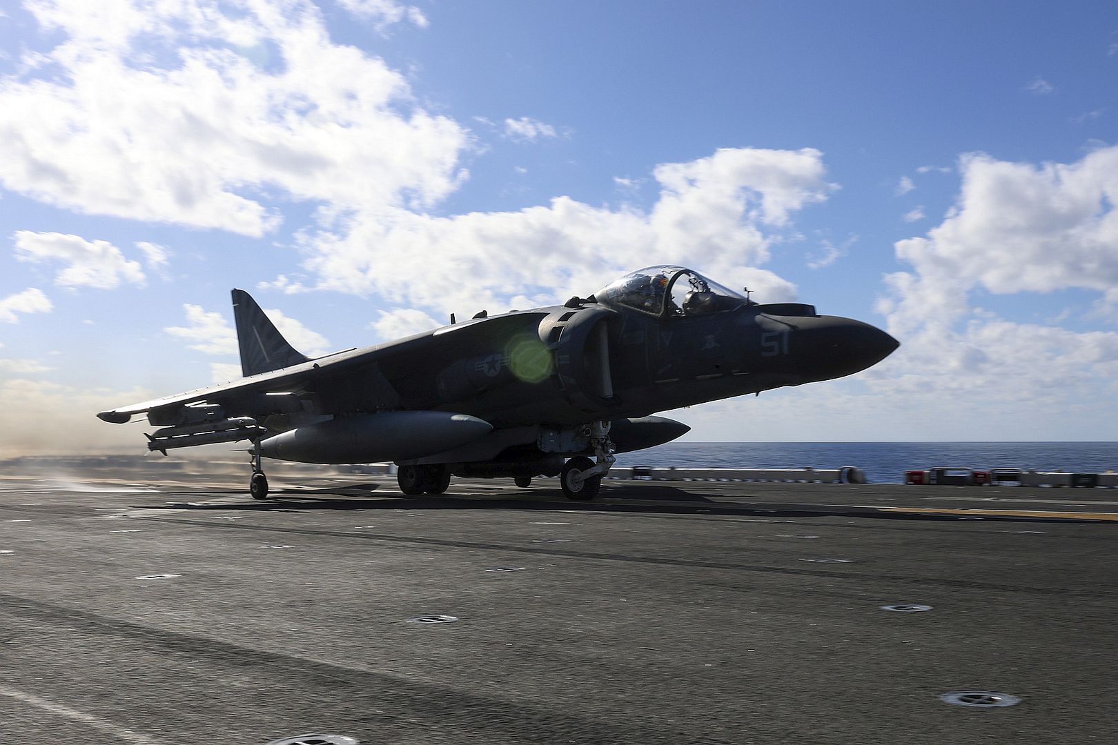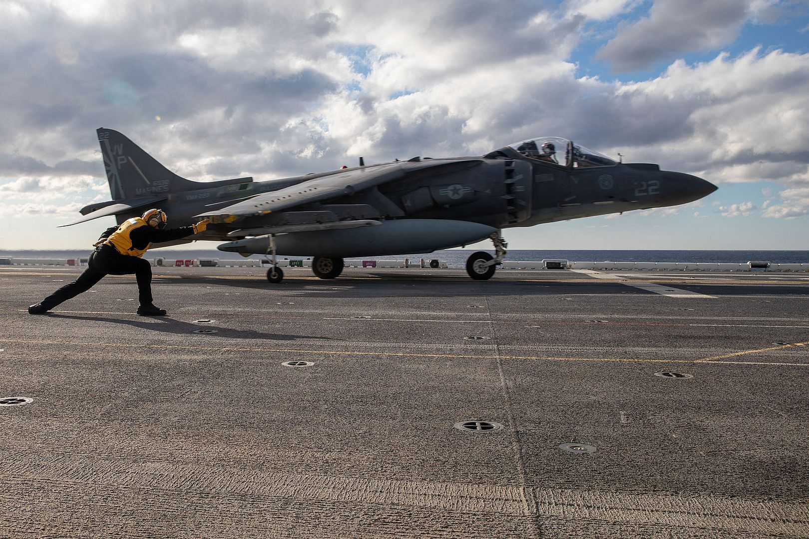 An AV-8B Harrier, assigned to Marine Attack Squadron (VMA) 223, takes off on the flight deck of the Wasp-class amphibious assault ship USS Iwo Jima (LHD 7), Dec. 3, 2024. Iwo Jima is underway conducting flight operations as part of its aviation qualifications. Amphibious assault ships, like Iwo Jima, project power and maintain presence by serving as the flagship of an amphibious ready group and expeditionary strike group at sea. (U.S. Navy photo by Mass Communication Specialist 2nd Class Isaac Rodriguez)