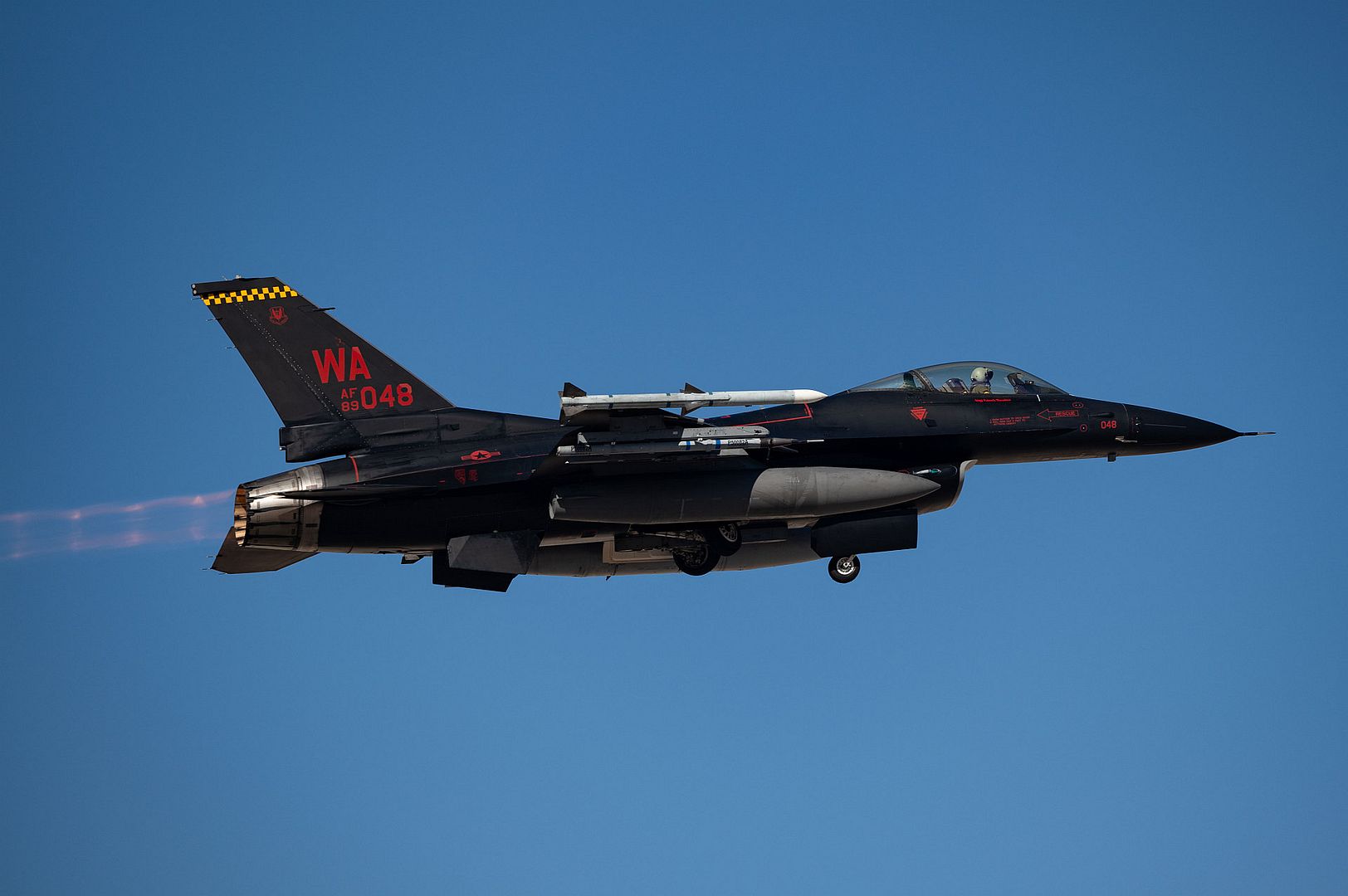 An F-16 Fighting Falcon assigned to the 64th Aggressor Squadron, takes off for a Weapons School Integration mission at Nellis Air Force Base, Nevada, Nov. 21, 2024. WSINT is a series of complex, large-force employment missions that serve as the capstone portion of Weapons School classes, which takes place twice a year. (U.S. Air Force photo by Senior Airman Josey Blades)