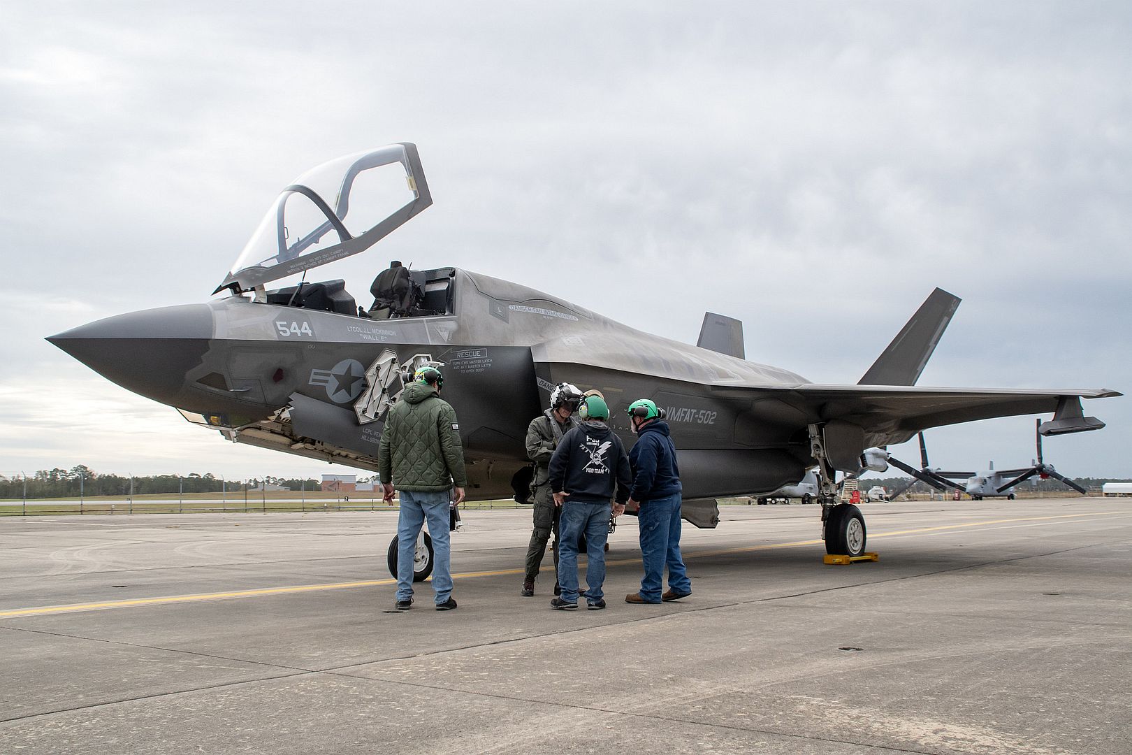 Workers on the Fleet Readiness Center East (FRCE) F-35 Lightning II aircraft modification line confer with the pilot prior to conducting a functional check flight inspection on an F-35B at Marine Corps Air Station Cherry Point. This aircraft is the 150th fifth-generation fighter inducted by the depot. FRCE is the lead site for depot-level maintenance on the F-35B Lightning II and has conducted modifications and repair on the Marine Corps’ short takeoff-vertical landing variant of the aircraft since 2013. FRCE also works with the F-35A (conventional takeoff and landing) and F-35C (carrier) variants. (Photo by Joe Andes, Fleet Readiness Center East Public Affairs.)