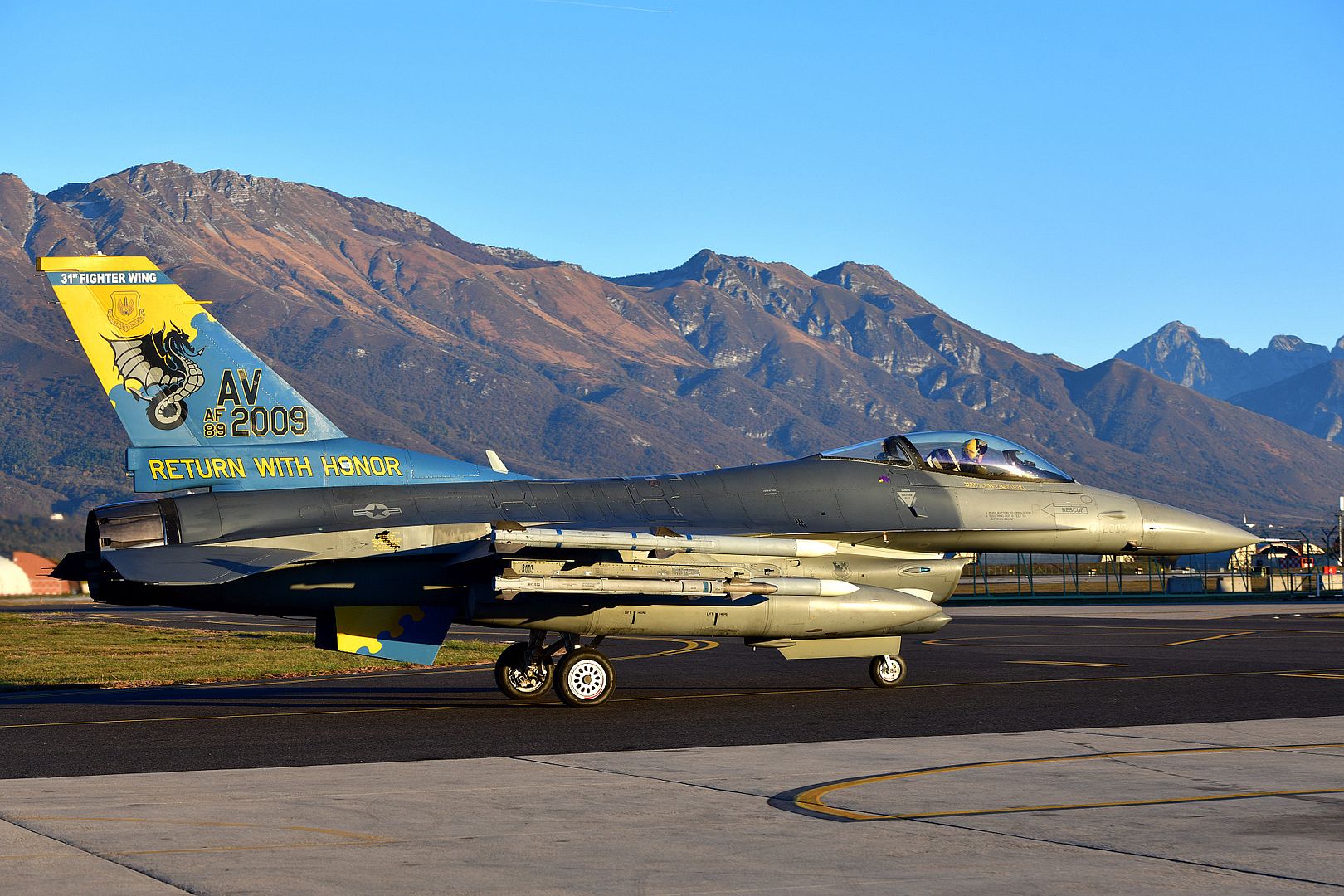 U.S. Air Force Brig. Gen. Tad Cark, 31st Fighter Wing commander, taxis to the runway in an F-16 Fighting Falcon at Aviano Air Base, Italy, Nov 21, 2024. The wing’s motto, “Return with Honor” is painted on the wing’s heritage tail as a reminder to respect the past and embrace the future. (U.S. Air Force photo by Staff Sgt. Heather Ley)