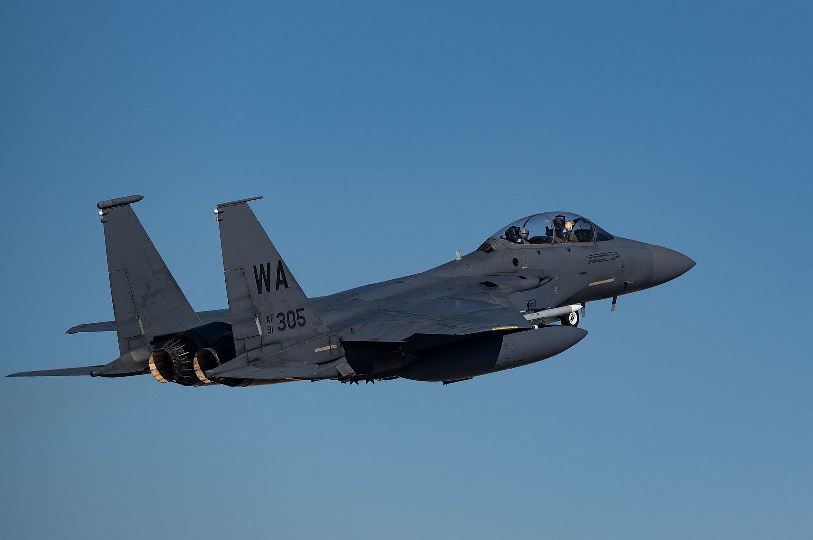 A U.S. Air Force F-15E Strike Eagle conducts a combat air patrol in support of Operation Inherent Resolve over the U.S. Central Command area of responsibility Nov. 23, 2024. F-15Es conduct missions within the AOR to compete strategically and deter Iran and its proxies. (Photo by Staff Sgt. Gerald Willis)