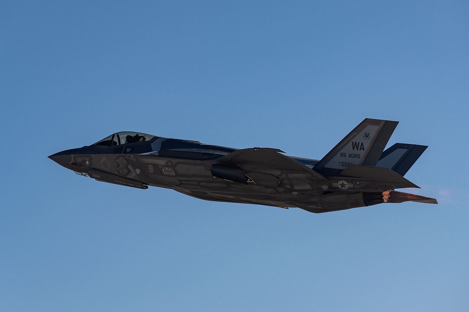 An F-35A Lightning II assigned to the 65th Aggressor Squadron, takes off for a Weapons School Integration mission at Nellis Air Force Base, Nevada, Nov. 21, 2024. WSINT is a series of complex, large-force employment missions that serve as the capstone portion of Weapons School classes, which takes place twice a year. (U.S. Air Force photo by Senior Airman Josey Blades)