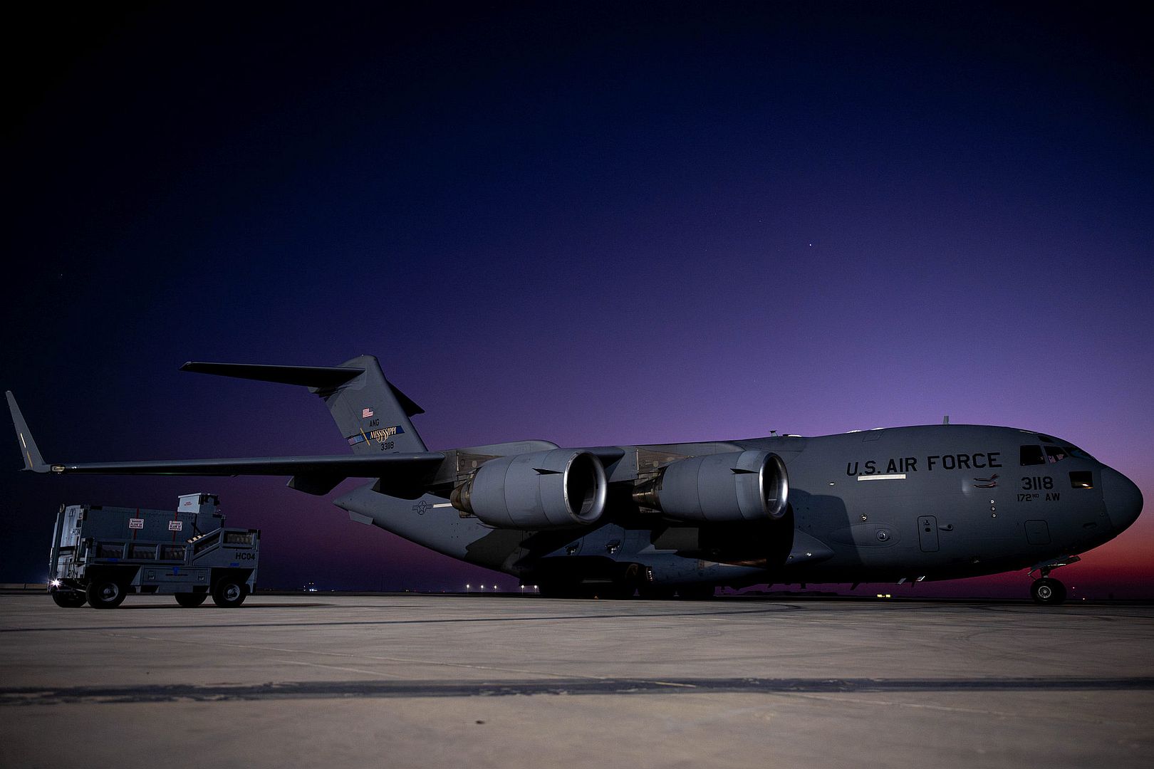 A C-17 Globemaster III assigned to the 183rd Expeditionary Airlift Squadron sits on a flightline within the U.S. Central Command area of responsibility, Nov. 20, 2024. The C-17 supports troop and cargo movements along with aeromedical evacuation operations. (Photo by Senior Airman Violette Hosack)