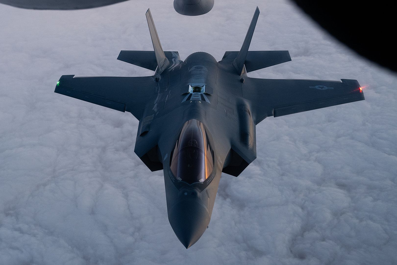 A U.S. Air Force F-35 Lightning II descends after receiving fuel from a KC-135 Stratotanker from the 100th Air Refueling Wing, Royal Air Force Mildenhall, England, during a Trilateral Bomber Task Force support mission over the North Sea, Dec. 3, 2024. BTF missions are representative of the U.S.’ extended deterrent commitment to our allies and partners and the enhancement of regional security. (U.S. Air Force photo by Senior Airman Christopher Campbell)