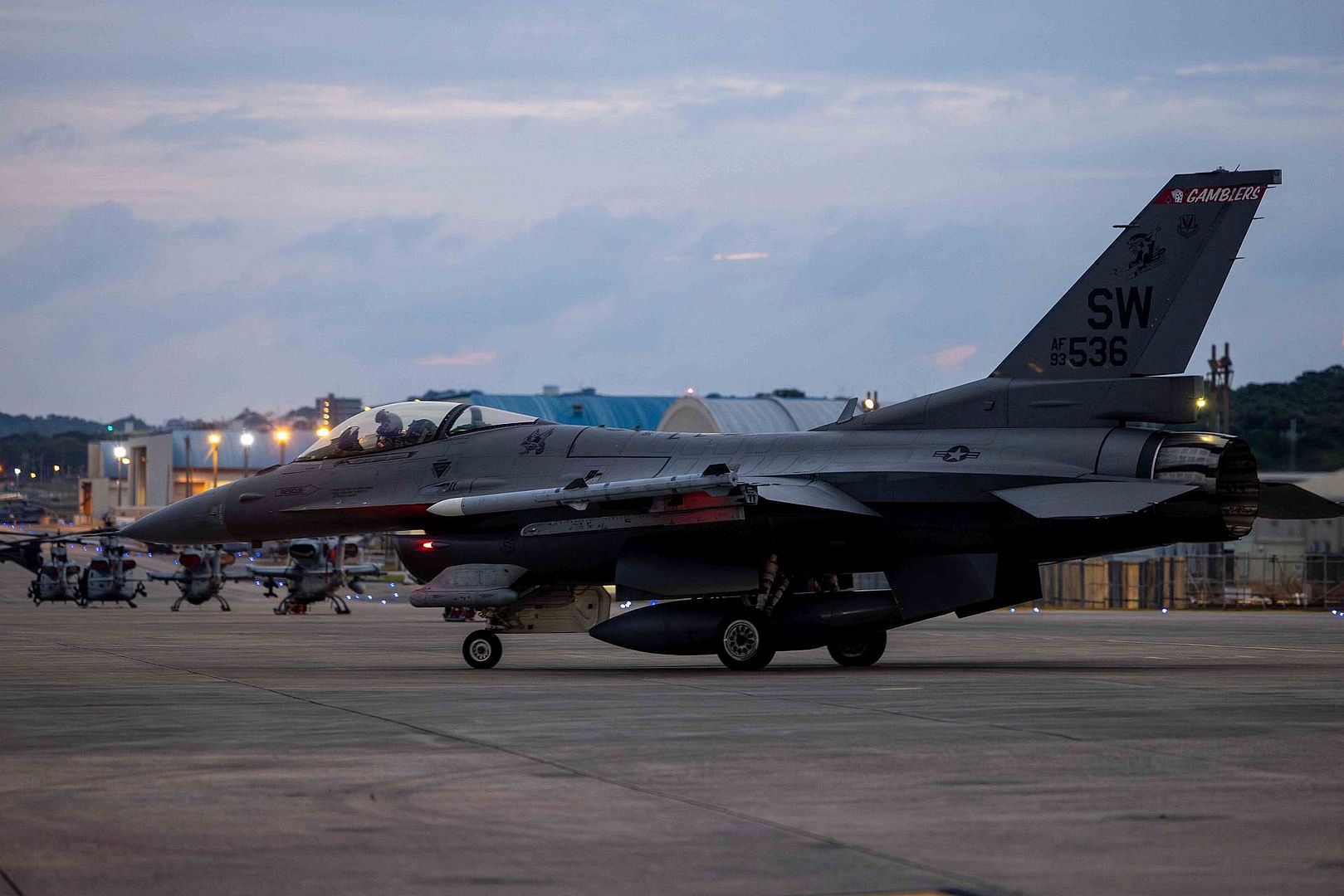 A U.S. Air Force F-16C Fighting Falcon assigned to the 77th Expeditionary Fighter Squadron, prepares for takeoff in support of an 18th Wing routine readiness exercise at Marine Corps Air Station Futenma, Japan, Jan. 15, 2025. While deployed to the Keystone of the Pacific, the 77th EFS ensures continued steady-state fighter capabilities in the region. (U.S. Marine Corps photo by Lance Cpl. Sav Ford)