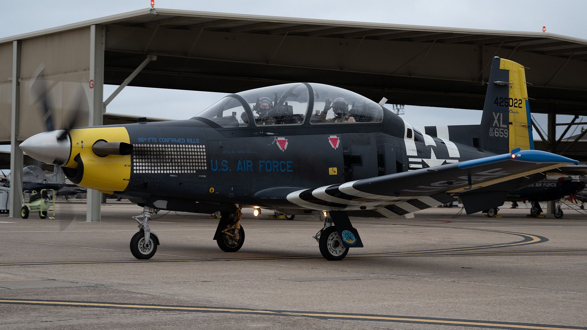 Main AdminA U.S. Air Force pilot from the 85th Flying Training Squadron (FTS) and an Airman from the 47th Medical Group (MDG) wave to the camera as they taxi towards the runway at Laughlin Air Force Base, Texas, Dec. 23, 2024. Airmen from the 47th MDG took part in immersion flights with the 85th FTS in T-6A Texan IIs. (U.S. Air Force photo by Staff Sgt. Nicholas Larsen)