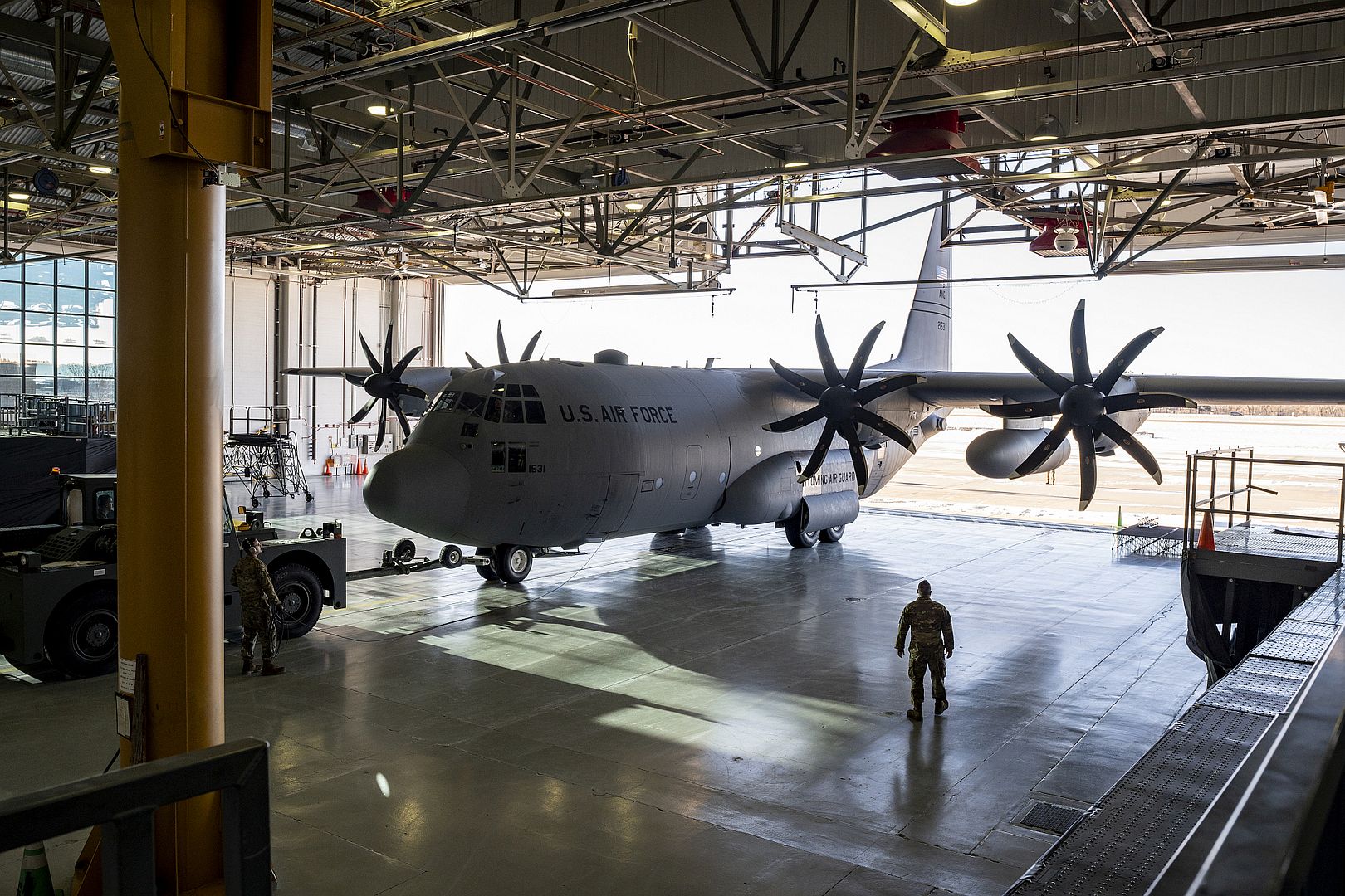 U.S. Air Force Airmen assigned to the 153rd Airlift Wing tow a C-130H Hercules aircraft out of a hangar in Cheyenne, Wyoming, Jan. 10, 2025, in preparation to support firefighting efforts in the Los Angeles area. U.S. Northern Command activated three Wyoming Air National Guard C-130s equipped with Modular Airborne Fire Fighting Systems (MAFFS) and associated personnel to assist firefighting efforts in California. MAFFS, developed by the U.S. Forest Service, are portable fire-retardant delivery systems that convert C-130s into airtankers, capable of releasing up to 3,000 gallons of retardant in under five seconds. (U.S. Air Force National Guard photo by Staff Sgt. Zachary Herold)
