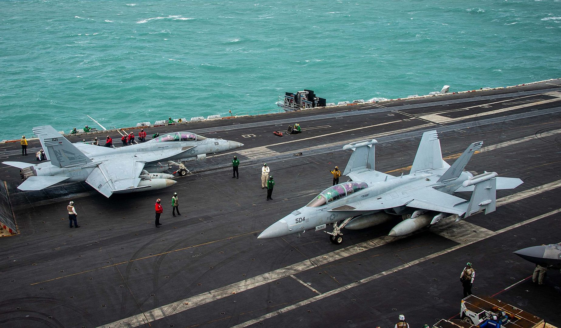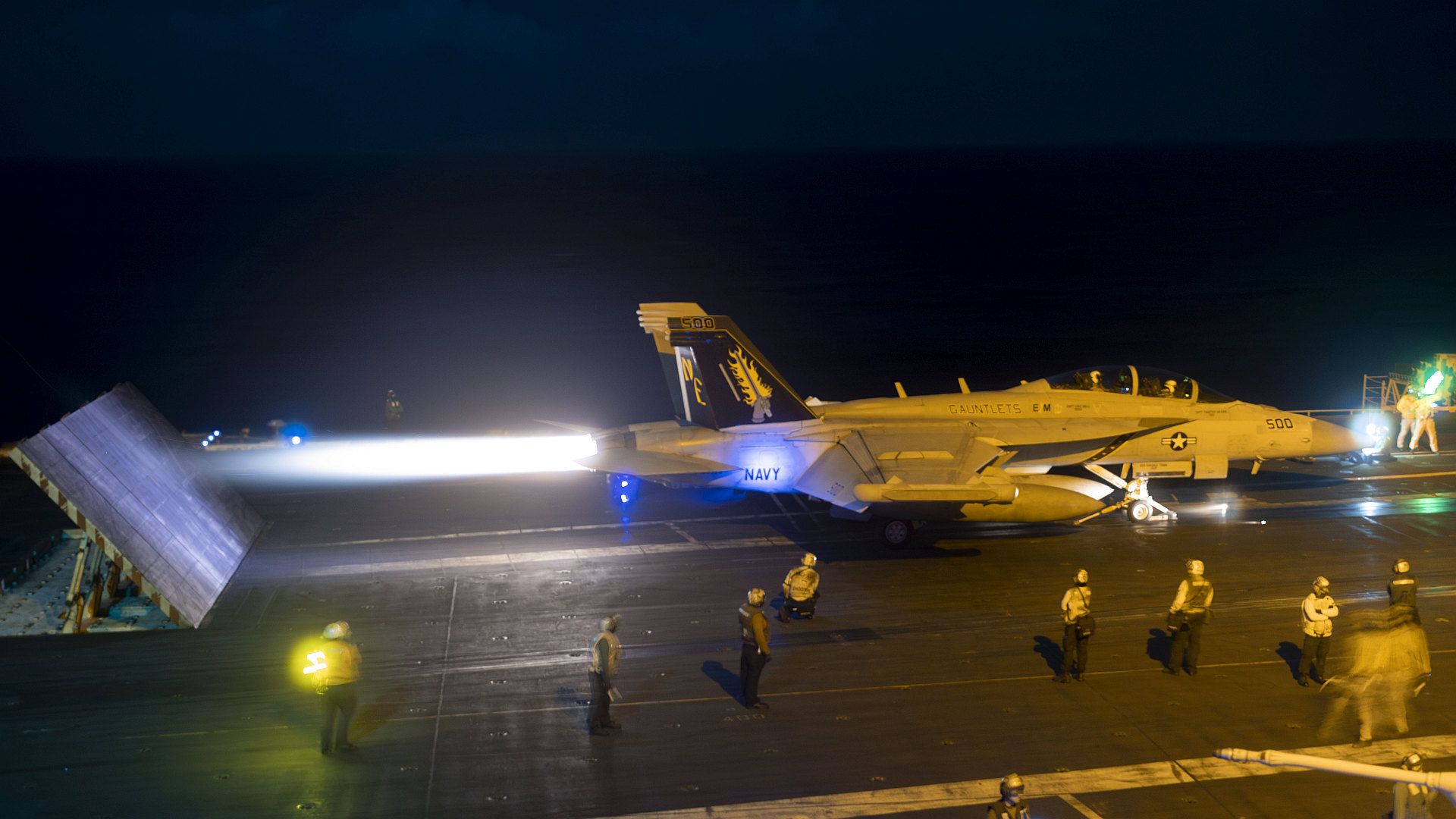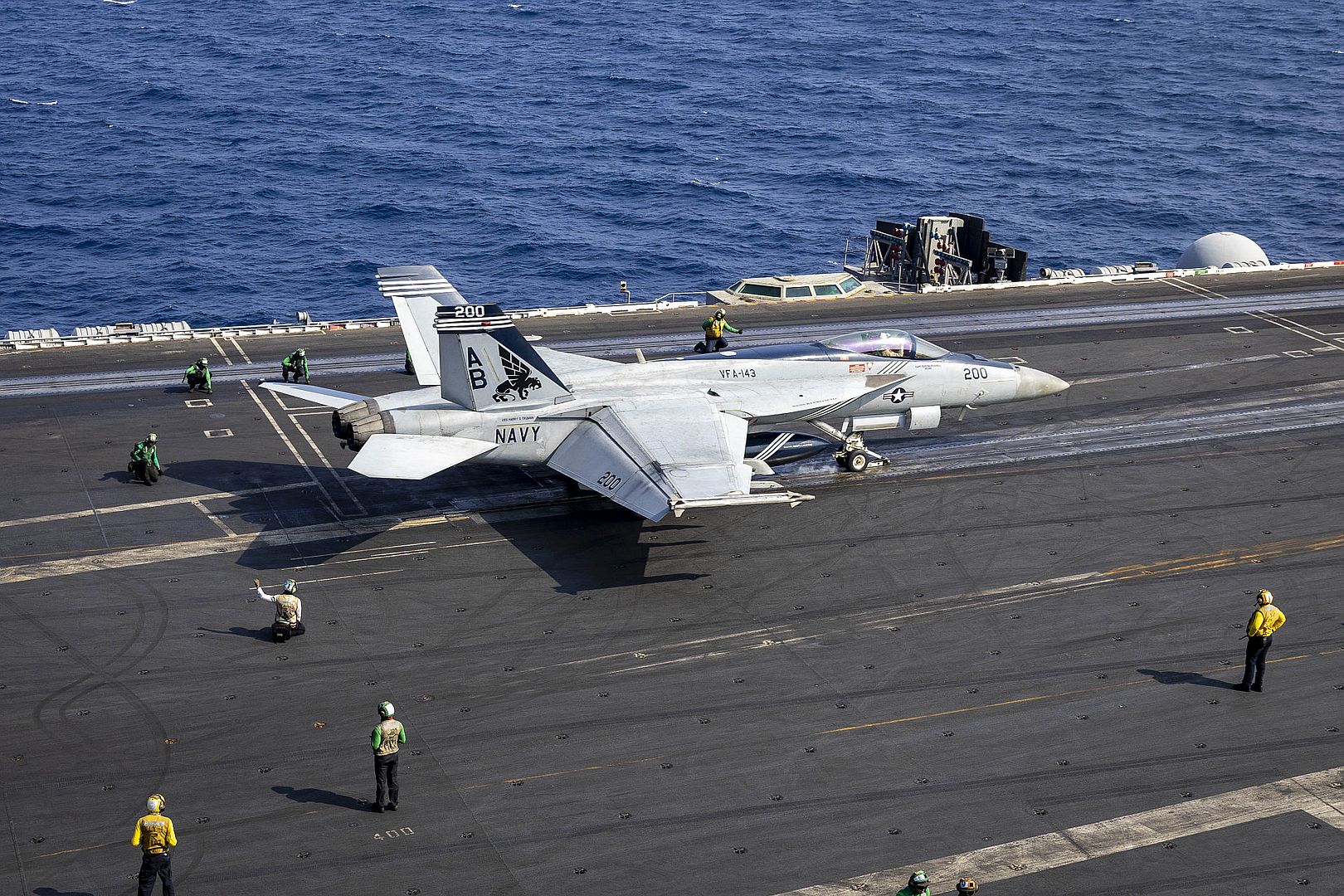 U.S. CENTRAL COMMAND AREA OF RESPONSIBILITY (Jan. 5, 2025) An F/A-18E Super Hornet, attached to Strike Fighter Squadron (VFA) 143, prepares for launch from the flight deck of the Nimitz-class aircraft carrier USS Harry S. Truman (CVN 75) in the U.S. Central Command area of responsibility. (Official U.S. Navy photo)