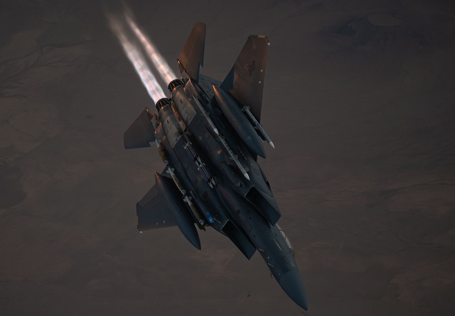 A U.S. Air Force F-15E Strike Eagle returns to combat patrols after being refueled over the U.S. Central Command area of responsibility Dec. 26, 2024. The F-15E Strike Eagle provides the capability to counter violent extremist organizations within the CENTCOM AOR through its agile use of air-to-ground weapons. (U.S. Air Force photo by Senior Airman Zachary Willis)