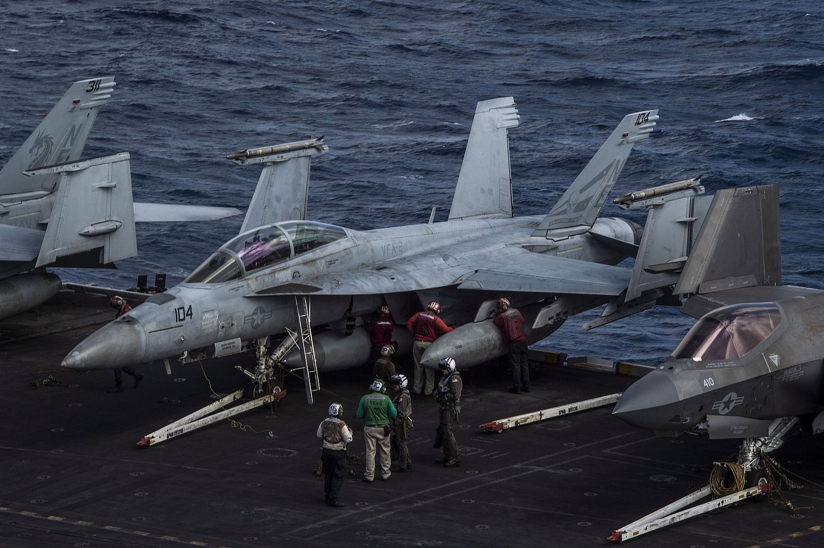 SOUTH CHINA SEA (Jan. 10, 2025) An F-35C Lightning II, assigned to the “Warhawks” of Strike Fighter Squadron (VFA) 97, waits to taxi across the flight deck aboard the Nimitz-class aircraft carrier USS Carl Vinson (CVN 70), Jan. 10, 2025. Vinson, the flagship of Carrier Strike Group ONE, is underway conducting routine operations in the U.S. 7th Fleet area of operations. (U.S. Navy photo by Mass Communication Specialist 3rd Class Nate Jordan)