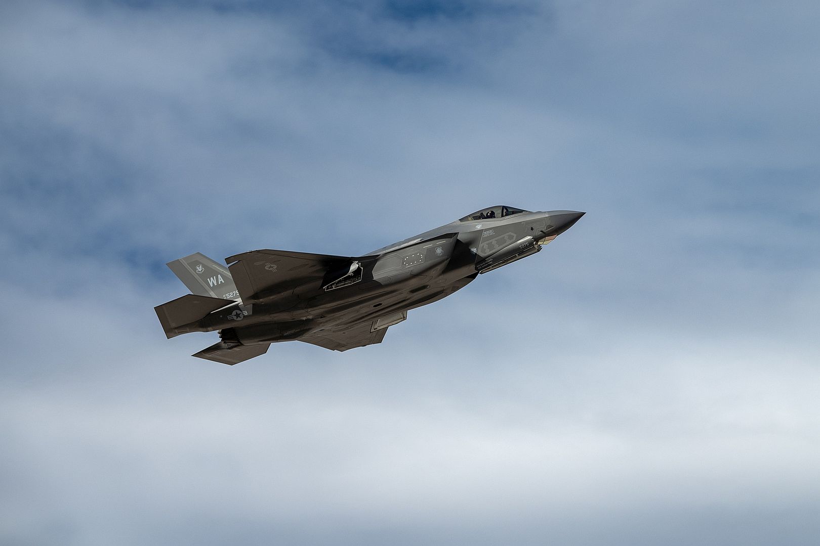 An F-35A Lightning II fighter jet assigned to the 6th Weapons Squadron, U.S. Air Force Weapons School, takes off for a training mission at Nellis Air Force Base, Nevada, Jan 7, 2025. With its advanced avionics, the F-35A provides next-generation stealth, enhanced situational awareness and reduced vulnerability for the United States and allied nations. (U.S. Air Force photo by William R. Lewis)