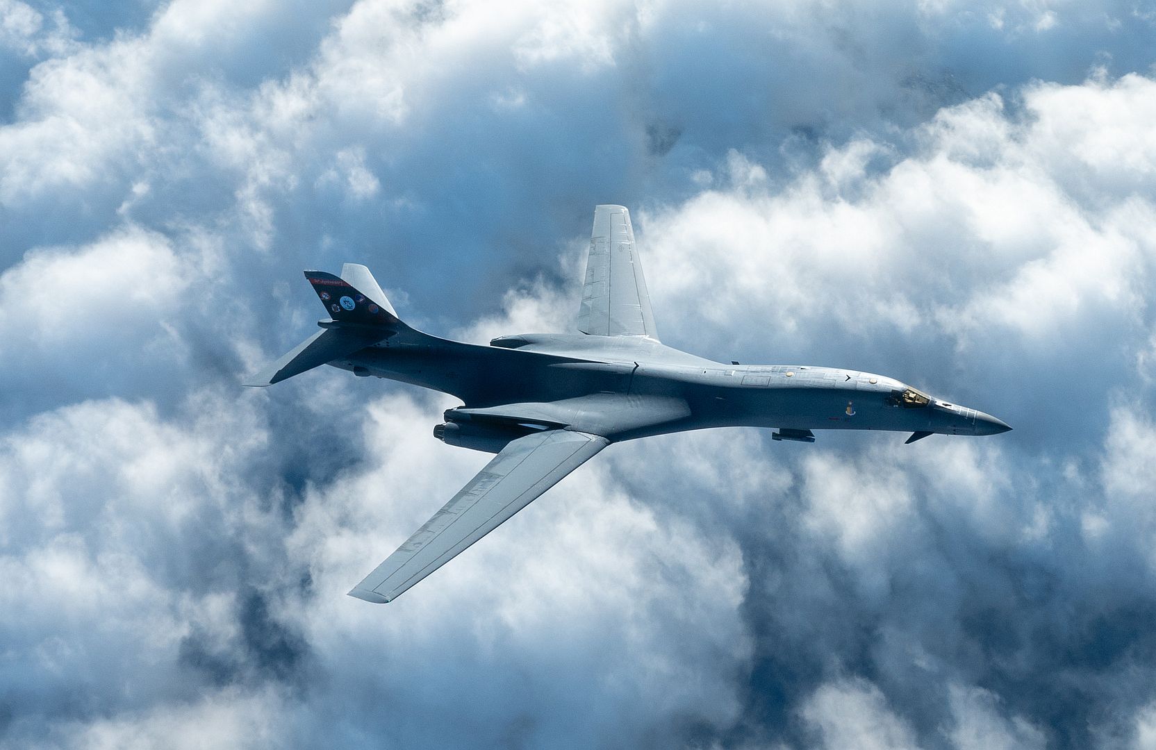 A U.S. Air Force B-1B Lancer assigned to the 34th Bomb Squadron, Ellsworth Air Force Base, South Dakota, descends after conducting aerial refueling with a KC-135 Stratotanker assigned to the 909th Air Refueling Squadron during a Bomber Task Force mission over the Pacific Ocean, Jan. 15, 2025. Bomber missions enhance readiness, to include joint and multi-lateral, to respond to any potential crisis or challenge, demonstrating the Department of Defense’s commitment to peace and prosperity throughout the Indo-Pacific region. (U.S. Air Force photo by Senior Airman Tylir Meyer)