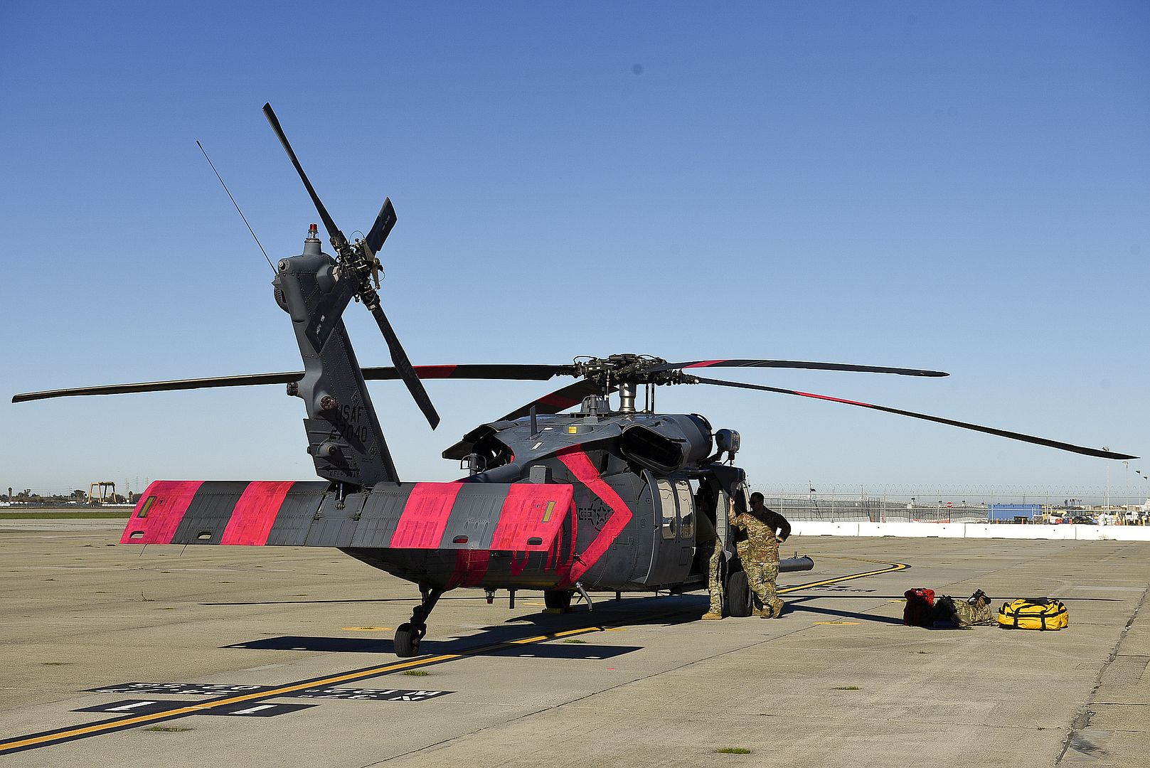 U.S. Air Force Airmen with the 129th Rescue Wing, California Air National Guard at Moffett Air National Guard Base, Calif., load equipment and a Bambi bucket onto an HH-60G Pave Hawk helicopter in support to the Palisades Fire, Jan. 9, 2025. The unit is activated by Calif. Governor Gavin Newsom, to assist with the fire-fighting efforts in Los Angeles, Calif. (U.S. Air Force photos by Master Sgt. Ray Aquino)