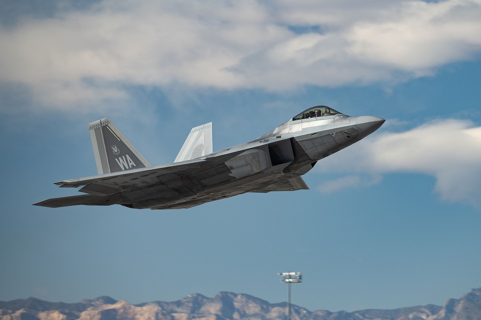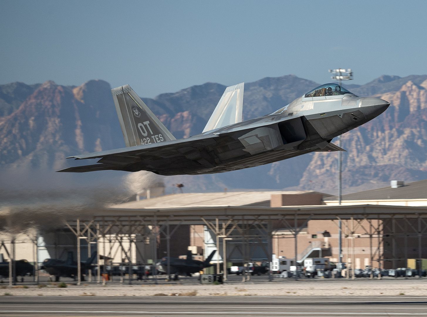An F-22 Raptor assigned to the 422nd Test and Evaluation Squadron, Nellis Air Force Base, Nevada, takes off for a mission during at Nellis Air Force Base, Nevada, Jan 7, 2025. The 422nd TES is a geographically separated unit of the 53rd Test and Evaluation Group, Eglin AFB, Florida and is responsible for delivering safe and effective capabilities and tactics that enhance the Combat Air Force's lethality and survivability. (U.S. Air Force photo by William R. Lewis)