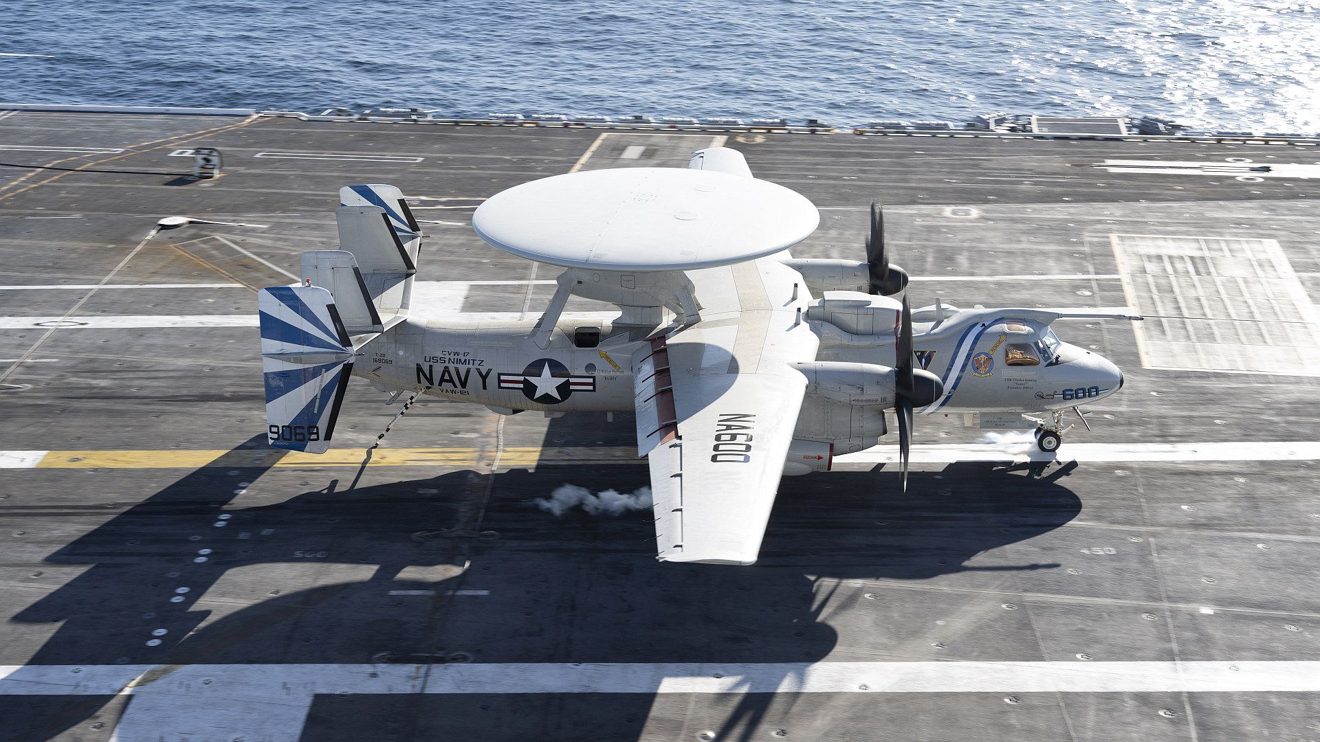 An E-2D Hawkeye assigned to the “Bluetails” of Carrier Airborne Early Warning Squadron (VAW) 121 makes an arrested landing on the flight deck of the aircraft carrier USS Nimitz (CVN 68) in the Pacific Ocean, Jan. 16, 2025. Nimitz is underway in 3rd Fleet conducting routine training operations. (U.S. Navy photo by Mass Communication Specialist 2nd Class Caylen McCutcheon)