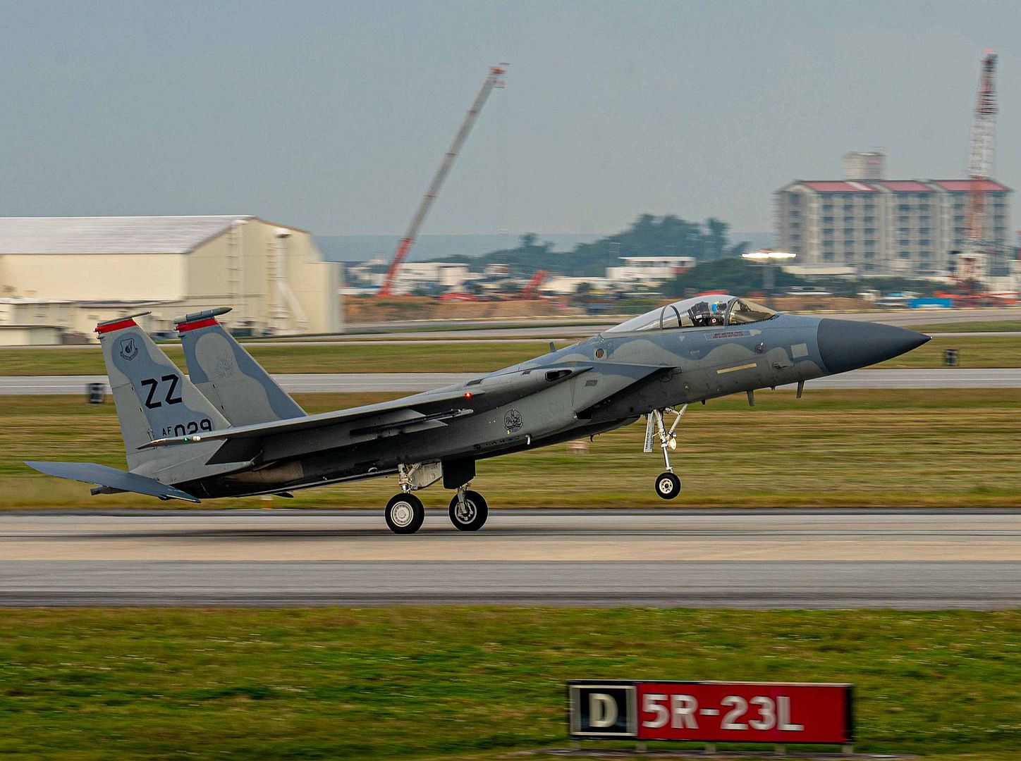 A U.S. Air Force F-15C Eagle lands during a base-wide, routine readiness exercise at Kadena Air Base, Japan, Jan. 15, 2025. Kadena serves as a hub for air power in the Pacific, ensuring readiness to project force capabilities and providing support to regional allies and partners when called upon. (U.S. Air Force photo by Airman 1st Class Catherine Daniel)