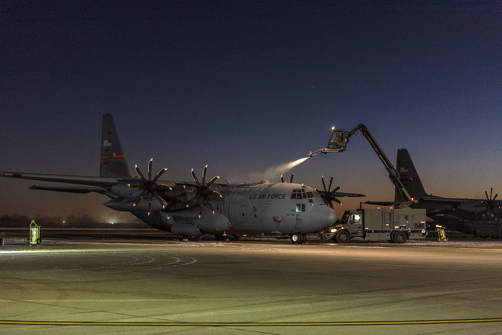 Airmen with the 182nd Aircraft Maintenance Squadron, Illinois Air National Guard, de-ice a C-130H Hercules in Peoria, Illinois, Jan. 15, 2025, in preparation for departure to Washington, D.C. Approximately 110 Soldiers and 30 Airmen from the Illinois National Guard mobilized to the U.S. capital in support of security operations for the 60th presidential inauguration. (U.S. Air National Guard photo by Master Sgt. Lealan Buehrer)