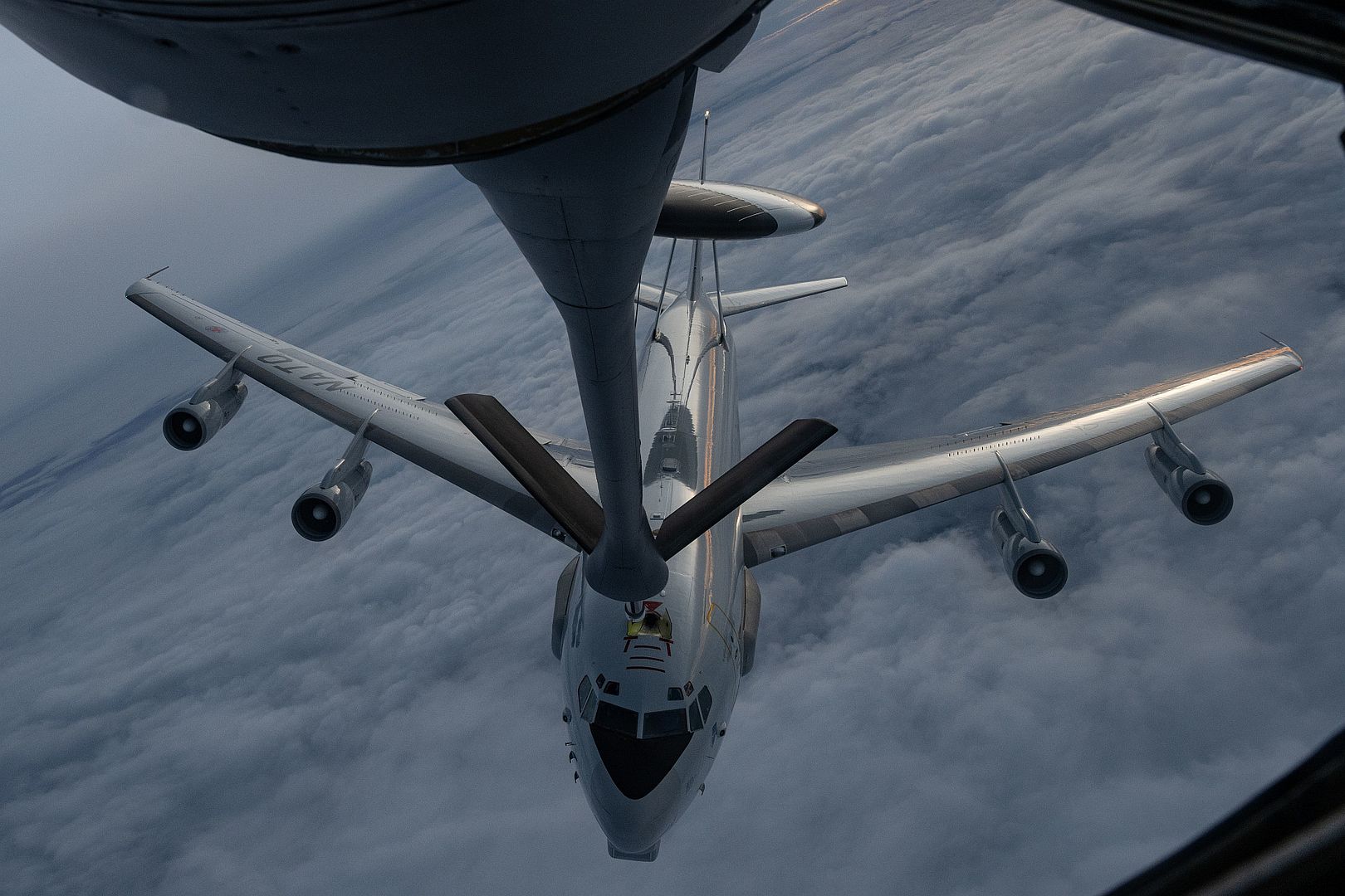 A NATO E-3 Sentry approaches a U.S. Air Force KC-135 Stratotanker from the 100th Air Refueling Wing, Royal Air Force Mildenhall, England, over Poland, Dec. 19, 2024. The KC-135 enabled the E-3 to maintain extended airborne endurance, providing uninterrupted radar coverage and seamless command and control capabilities critical to mission success. (U.S. Air Force photo by Staff Sgt. Jesenia Landaverde)