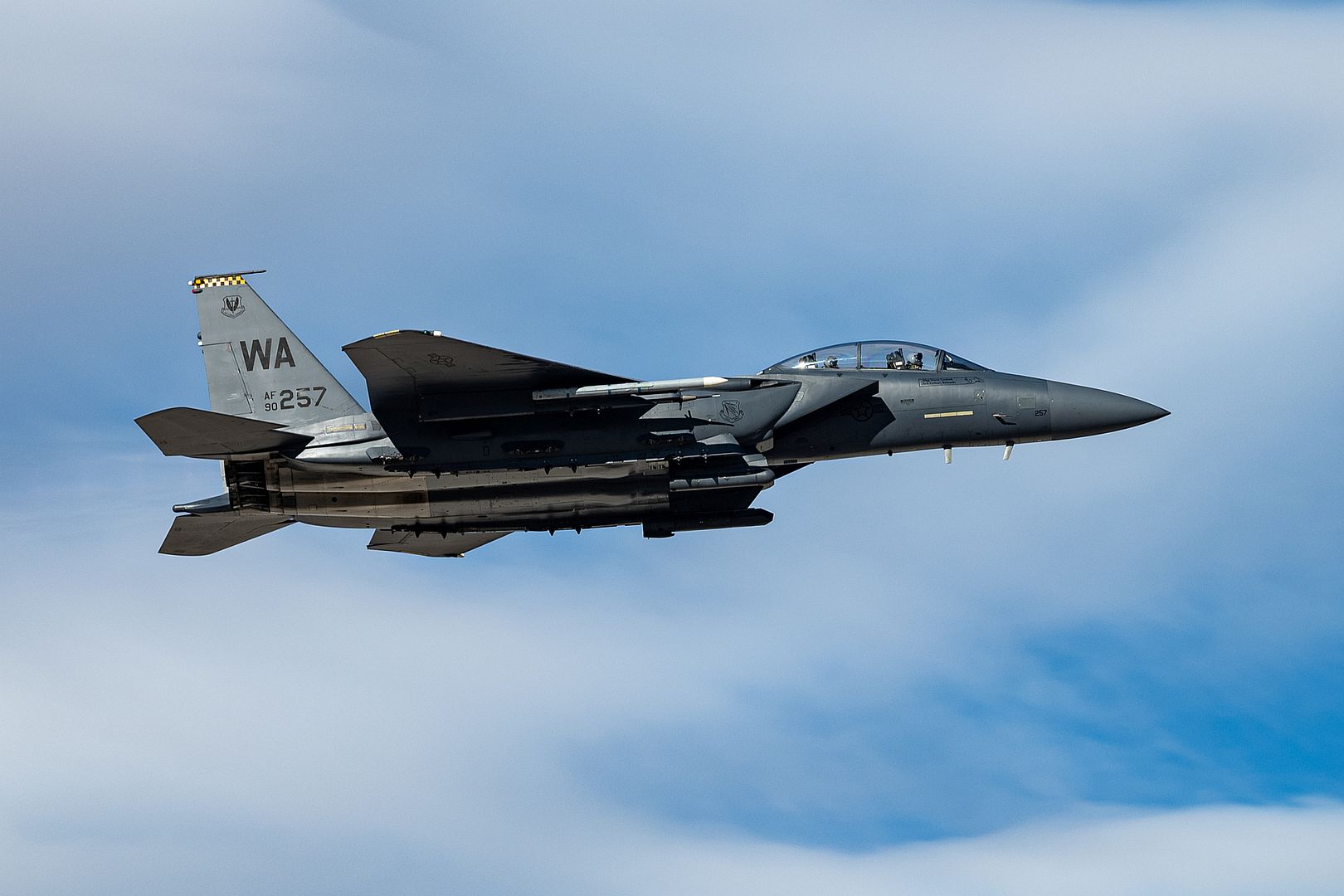 A U.S. Air Force F-15E Strike Eagle aircraft arrives at RAF Lakenheath, England Jan. 15, 2025. The F-15E Strike Eagles aircraft are equipped with the Eagle Passive/Active Warning and Survivability System marking the delivery of the first F-15E’s integrated with one of the world’s most advanced electronic warfare suites in the European theater.