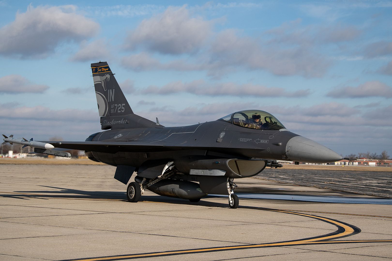 A U.S. Air Force F-16 Fighting Falcon aircraft, assigned to the 122nd Fighter Wing, taxis on the flight line at the 122nd Fighter Wing in Fort Wayne, Indiana, Dec. 17, 2024. The F-16 returned from a routine training mission. (U.S. Air National Guard photo by Senior Airman Halley Clark)