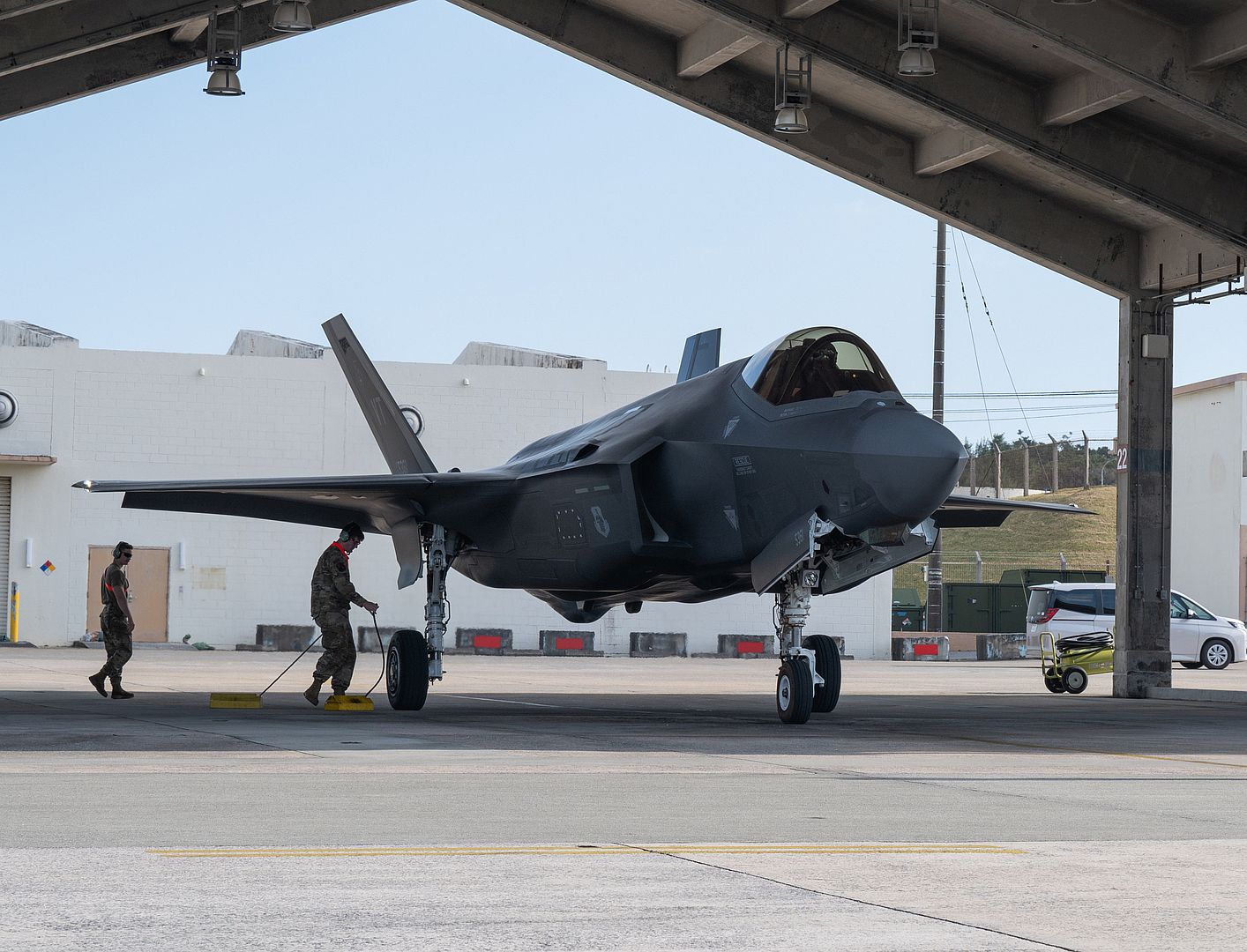 A U.S. Air Force F-35A Lightning II assigned to the 134th Expeditionary Fighter Squadron parks after arriving at Kadena Air Base, Japan, Jan. 13, 2025. The F-35A is an agile, versatile, high-performance, 9g capable multirole fighter that combines stealth, sensor fusion and unprecedented situational awareness. (U.S. Air Force photo by Senior Airman Tylir Meyer)