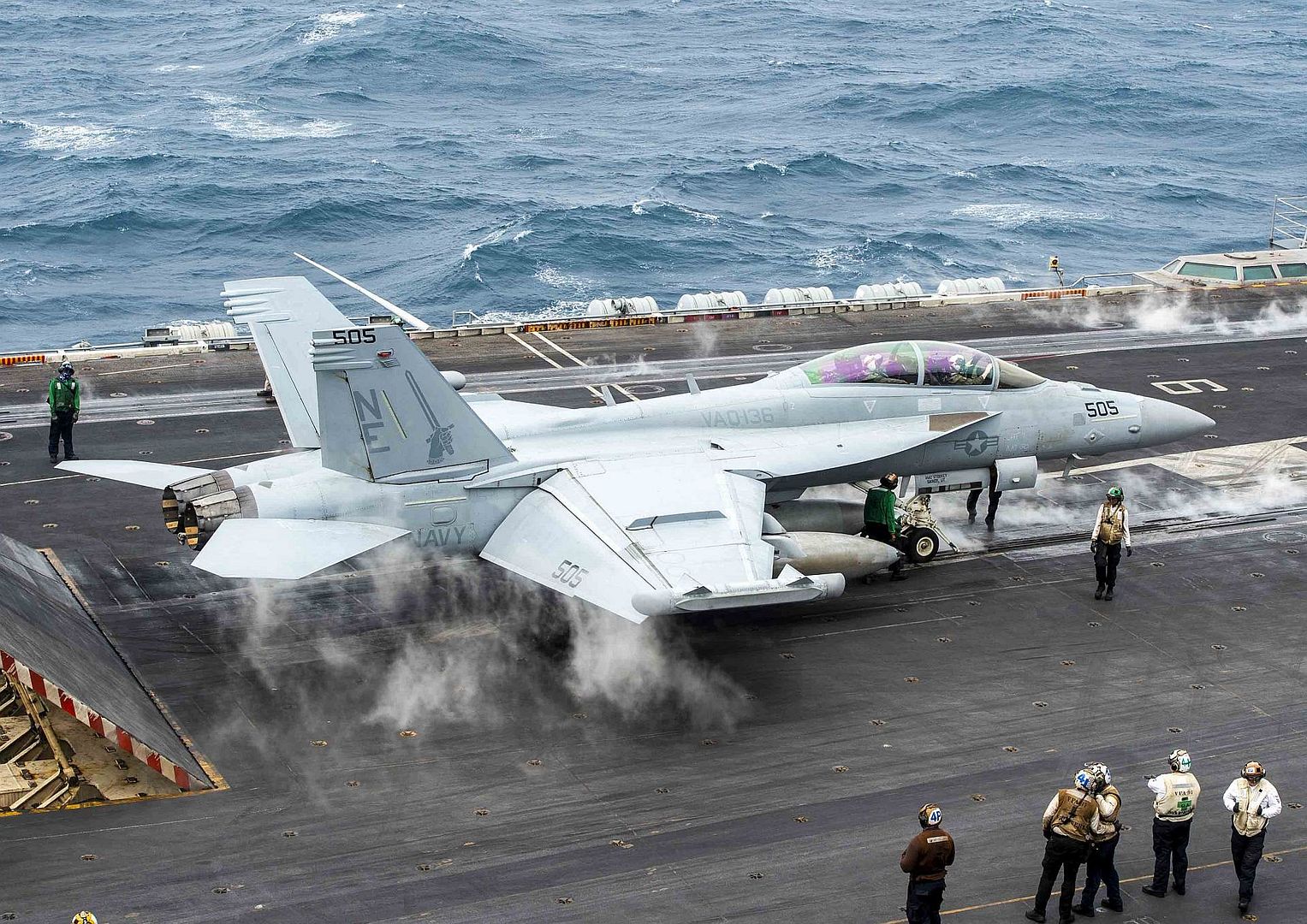 SOUTH CHINA SEA (Jan. 10, 2025) An EA-18G Growler, assigned to the “Gauntlets” of Electronic Attack Squadron (VAQ) 136, prepares to launch from the flight deck of the Nimitz-class aircraft carrier USS Carl Vinson (CVN 70), Jan. 10, 2025. Vinson, the flagship of Carrier Strike Group ONE, is underway conducting routine operations in the U.S. 7th Fleet area of operations. (U.S. Navy photo by Mass Communication Specialist 3rd Class Nate Jordan)