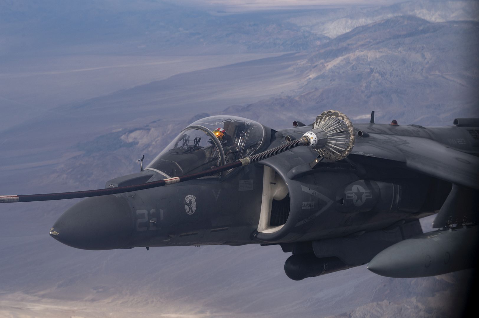 A U.S. Marine Corps AV-8B Harrier II with Marine Attack Squadron 231 receives fuel from a MC-130J Commando II assigned to Air Force Special Operations Command during Emerald Warrior 25.1, Southwest United States, Feb. 3, 2025. Throughout Exercise Emerald Warrior, AFSOC integrates joint and partner training opportunities to foster interoperability and maintain international force capabilities. (U.S. Air Force photo by Senior Airman Rachel Pakenas)