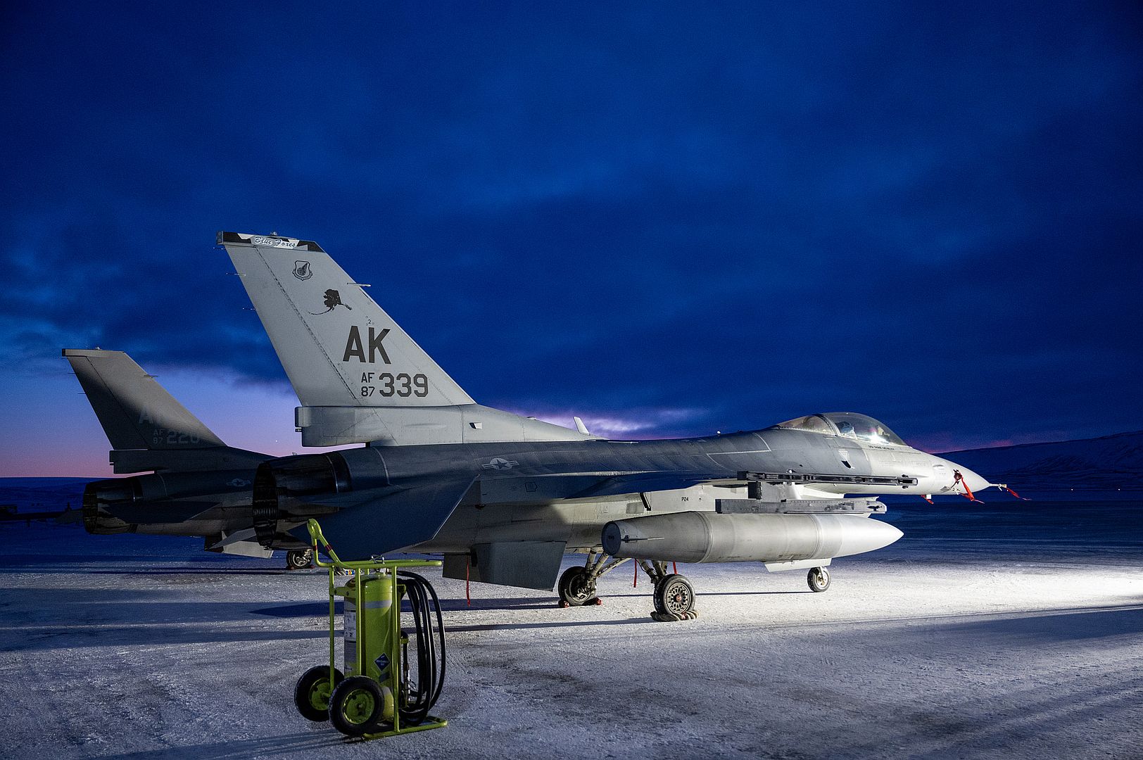 F-16 Fighting Falcon aircraft assigned to the 18th Fighter Interceptor Squadron from Eielson Air Force Base, Alaska, are placed on the flightline during Operation NOBLE DEFENDER at Pittufik Space Base, Greenland, Jan. 29, 2025. Operation NOBLE DEFENDER is an air defense operation under the direction of the North American Aerospace Defense Command designed to demonstrate the command’s ability to defend the approaches of North America from current and future threats while integrating across domains with partners and allies. NORAD routinely conducts sustained, dispersed operations in defense of North America through one or all three NORAD regions, include Alaska, Canada and the continental U.S. (U.S. Air Force photo by Tech. Sgt. Christopher Ruano)