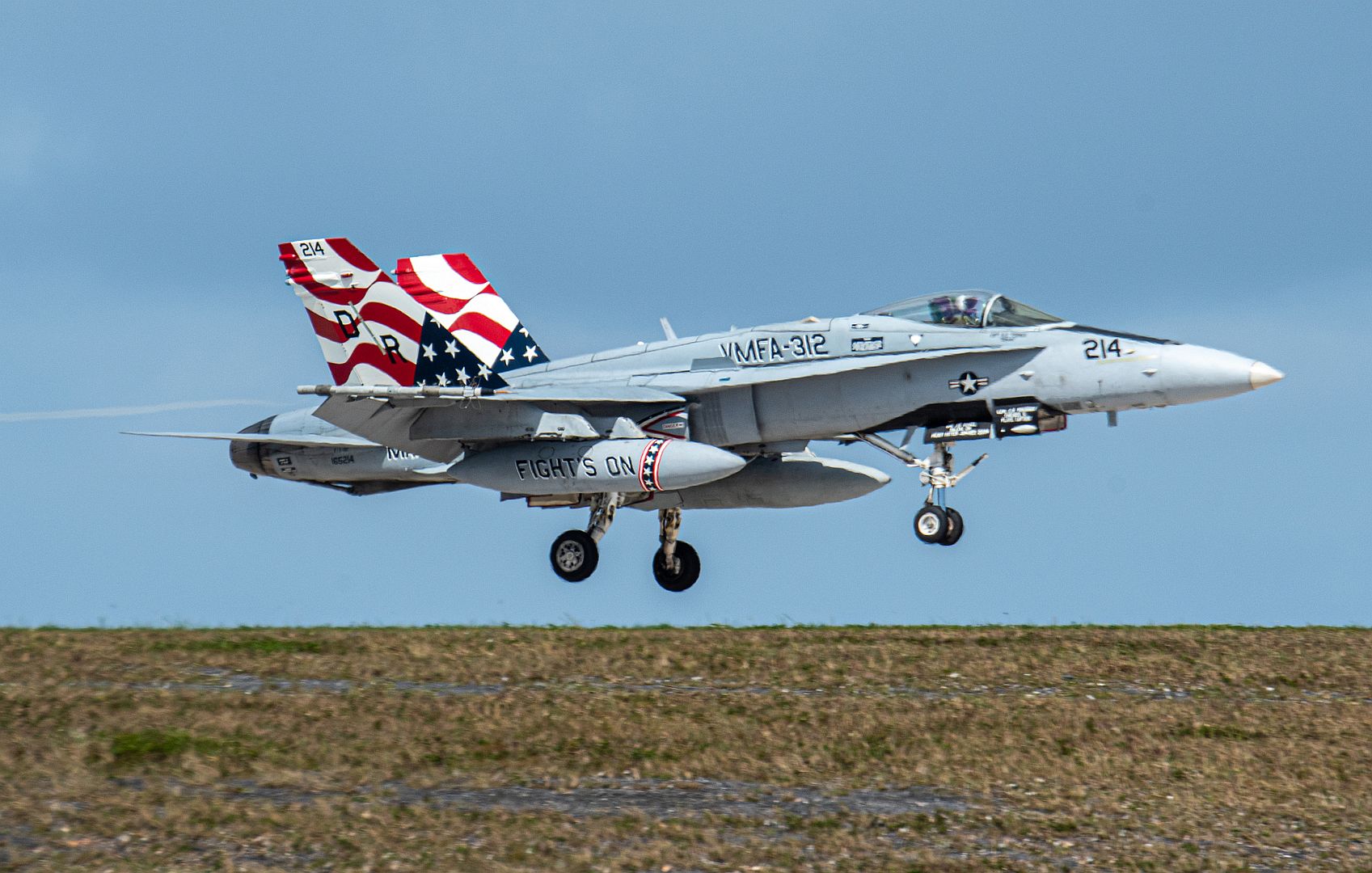 A U.S. Marine Corps F/A-18C Hornet, assigned to Marine Fighter Attack Squadron 312, lands during exercise Cope North 25 at Andersen Air Force Base, Guam, Feb. 13, 2025. The aircraft participating in CN25 engage in realistic combat training, an essential part of ensuring the success of air and space operations. (U.S. Air Force photo by Airman 1st Class Tala Hunt)