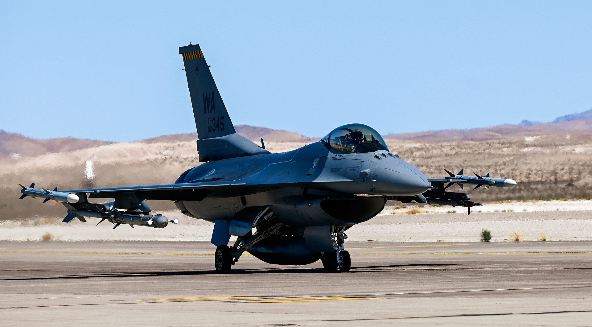 United Arab Emirates Air Force (UAEAF) F-16E Desert Falcons prepare for takeoff in support of Red Flag-Nellis 25-2 at Nellis Air Force Base, Nevada, March 7, 2025. UAEAF F-16Es provide high maneuverability as well as an active jamming system and passive electronic support capabilities that provide enhanced situational awareness. (U.S. Air Force photo by Senior Airman Jordan McCoy)