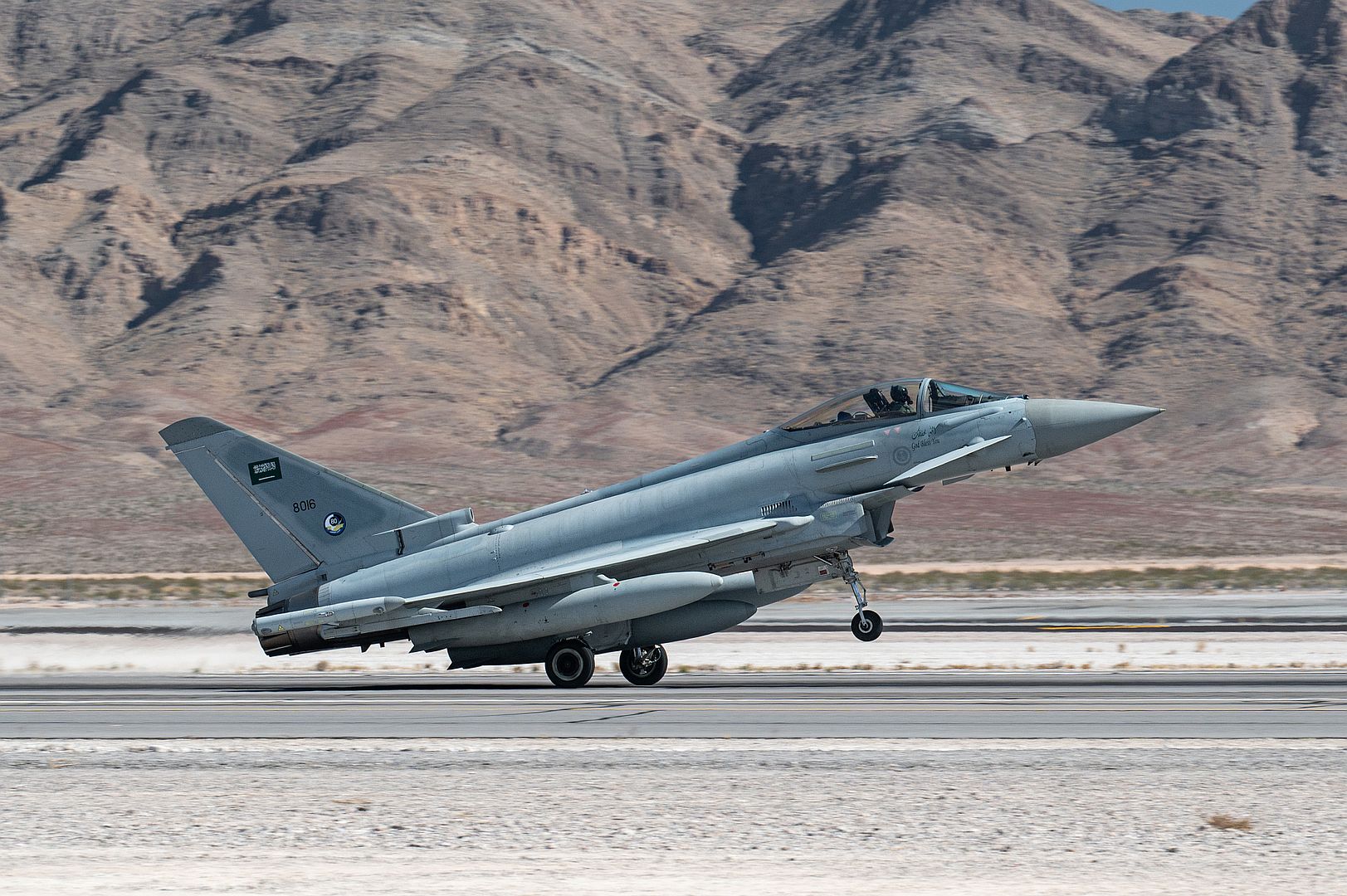 Royal Saudi Air Force Typhoons take off in preparation for Red Flag-Nellis 25-2 from Nellis Air Force Base, Nevada, March 6, 2025. Red Flag-Nellis 25-2 provides advanced training in a combined environment to enhance interoperability between international, joint and interagency allies and partners. (U.S. Air Force photos by Airman 1st Class Brianna Vetro)