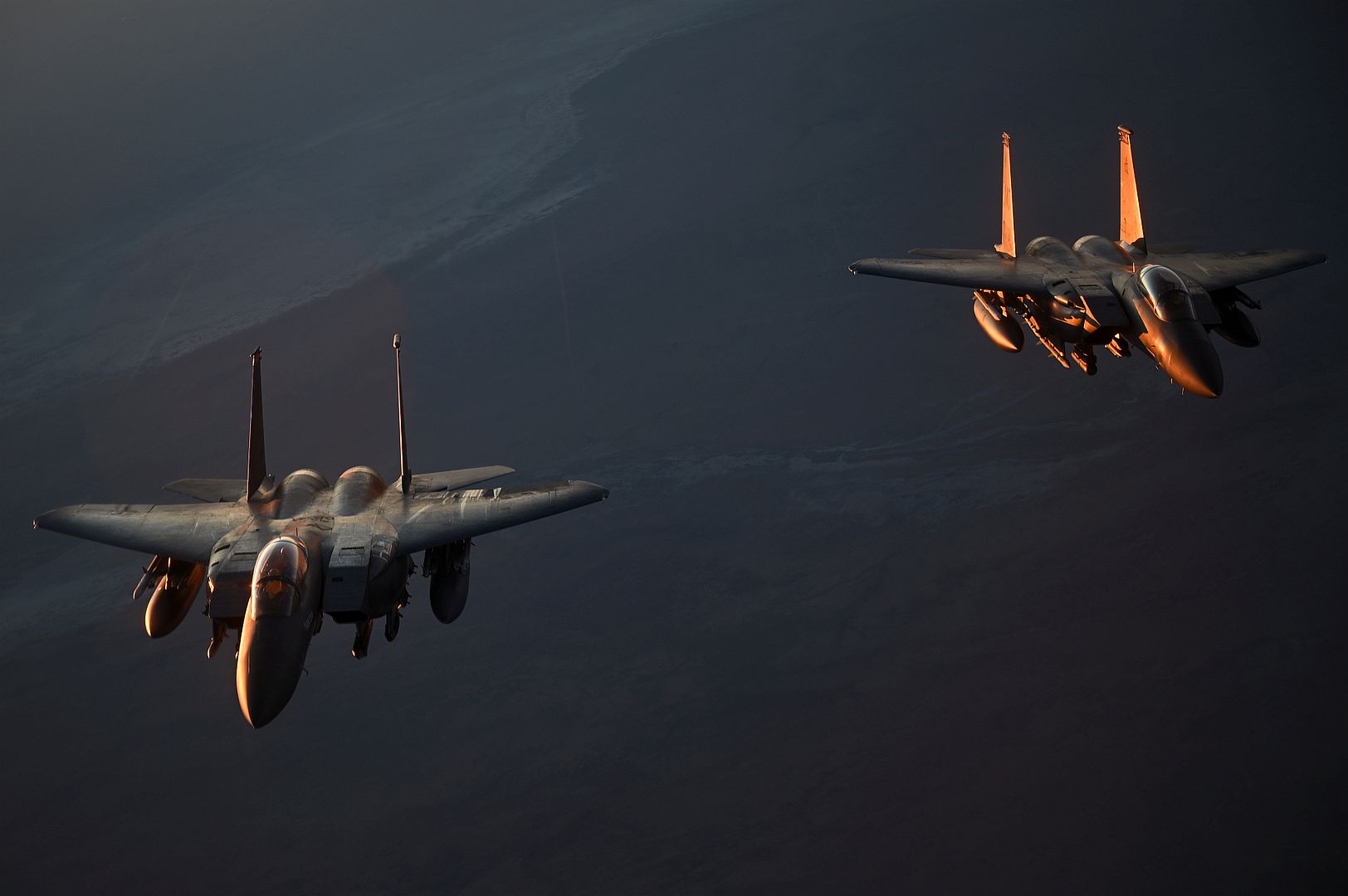 Two U.S. Air Force F-15E Strike Eagles fly in formation during a combat air patrol mission over the U.S. Central Command area of responsibility, March 2, 2025. The F-15E provides essential overwatch of the CENTCOM AOR to deter regional aggression and protect coalition partners. (U.S. Air Force photo by Staff Sgt. Gerald Willis)