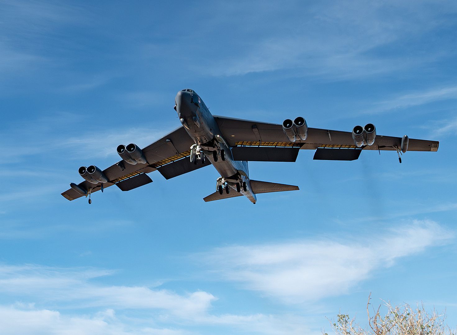 A U.S. Air Force B-52 Stratofortress assigned to the 5th Bomb Wing, Minot Air Force Base (AFB), North Dakota, arrives to Nellis AFB for Red Flag-Nellis 25-2, March 10, 2025. Red Flag provides unique training with an emphasis on Airmen and Guardians’ readiness for high-end warfighting and strategic competition. (U.S. Air Force photo by William R. Lewis)