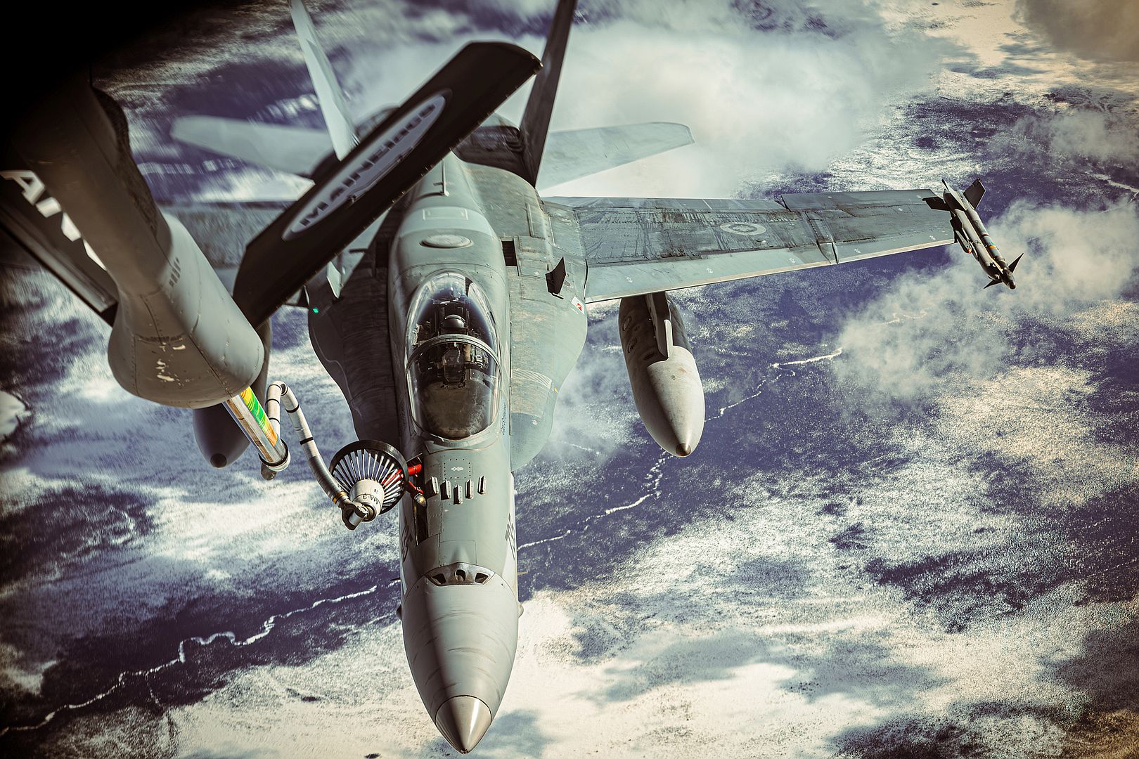 A RCAF CF-18 Hornet receives a mid-air refueling from a KC-135 Stratotanker during air-defense Operation NOBLE DEFENDER, March 17, 2025. NORAD conducts sustained, dispersed operations across the North American continent, through one or all NORAD regions (Alaska, Canada, and the Continental U.S.). Strategic bomber missions enhance the readiness and training necessary to respond to any potential crisis or challenge around the globe. Bomber missions demonstrate the credibility of our forces to address an ever-changing global security environment. (U.S. Air National Guard photo by Senior Master Sgt. Andrew Sinclair)
