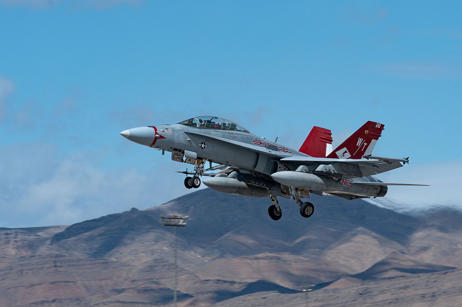 A U.S. Navy EA-18G Growler assigned to Electronic Attack Squadron 132, Naval Air Station Whidbey Island, Washington, takes off during Red Flag 25-2 at Nellis Air Force Base, Nevada, March 13, 2025. Exercises like Red Flag increase interoperability between partner nations and across the joint force as Airmen train together against high-end, realistic scenarios. (U.S. Air Force photo by Senior Airman Kyle Wilson)