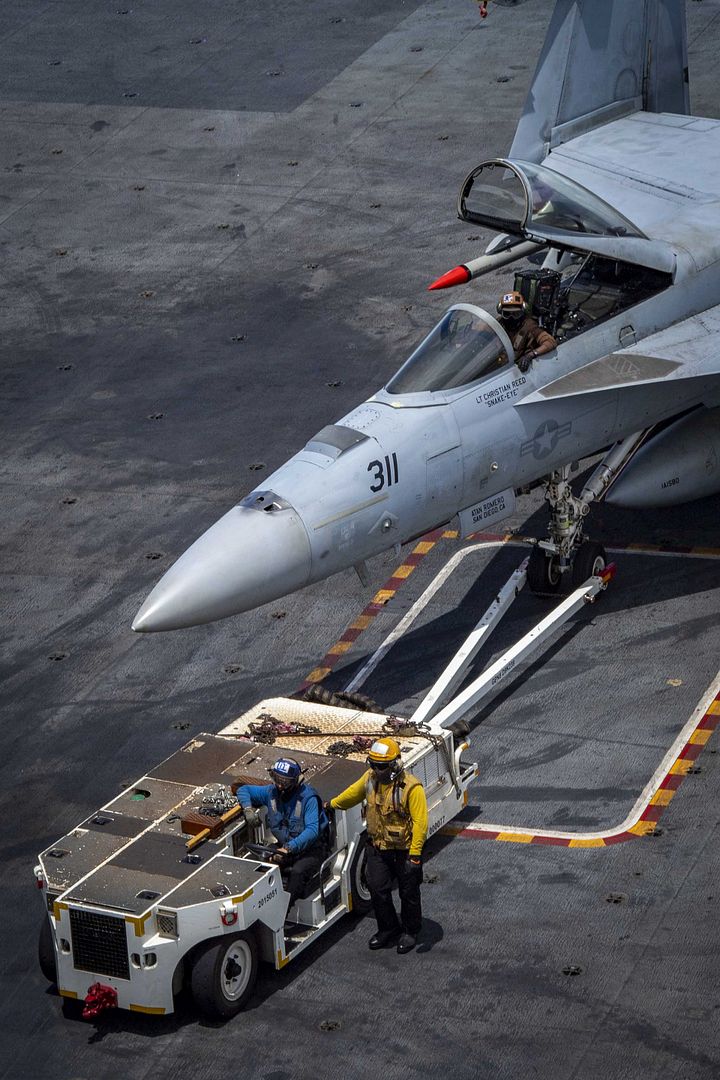 Main AdminSailors taxi an F/A-18E Super Hornet from the “Kestrels” of Strike Fighter Squadron (VFA) 137 across the flight deck of the aircraft carrier USS Nimitz (CVN 68) in the South China Sea, May 12, 2025. Nimitz is underway in the U.S. 7th Fleet area of operations on a scheduled deployment, demonstrating the U.S. Navy's unwavering commitment to a free and open Indo-Pacific. (U.S. Navy Photo by Mass Communication Specialist Seaman Apprentice Franklyn M. Guage)